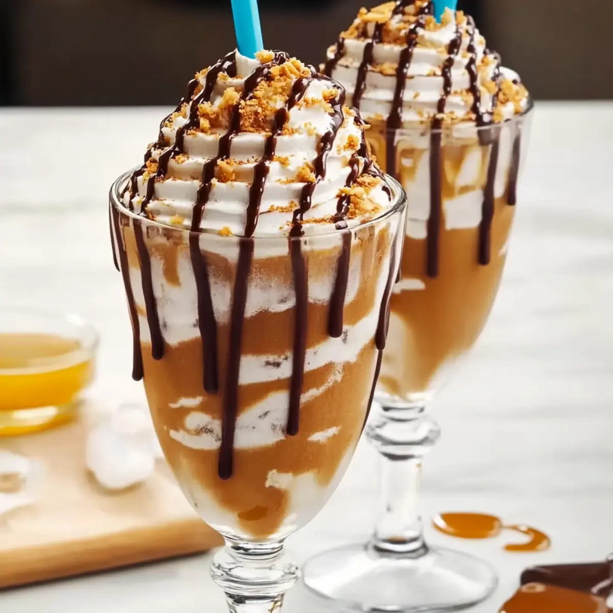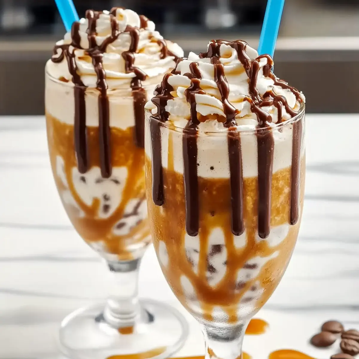 - Serve and Garnish: Pour slushies into chilled glasses. Drizzle with chocolate sauce, add whipped cream, and drizzle with caramel before serving.