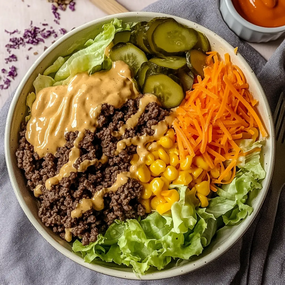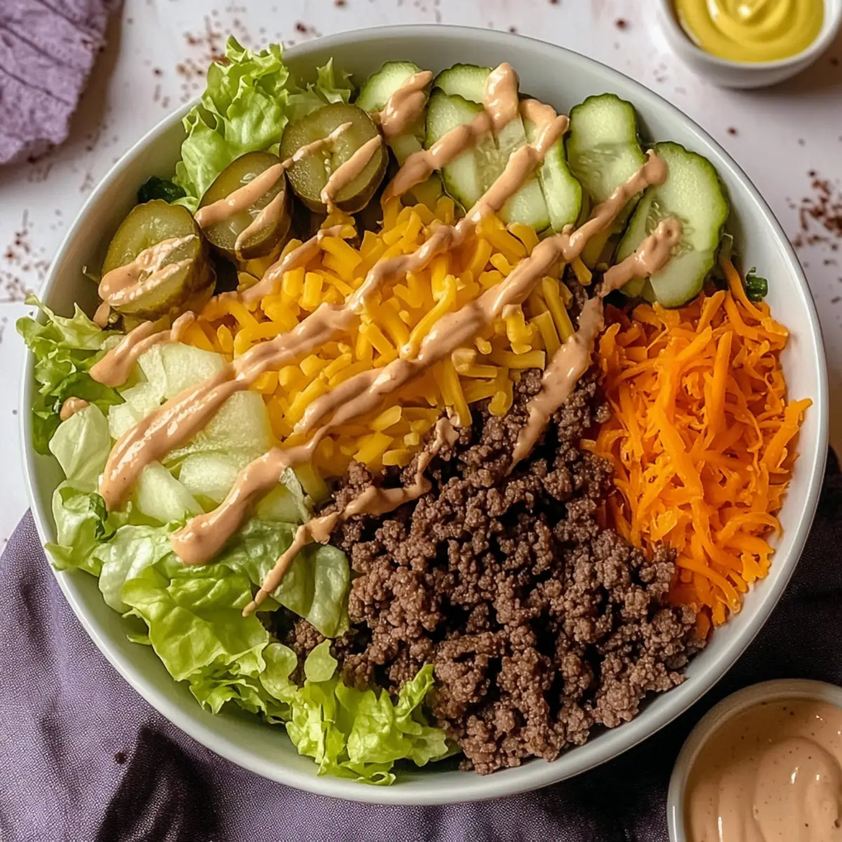 - Assemble Your Salad: In a salad bowl, layer chopped lettuce, then beef, onions, pickles, and cheese. Keep special sauce separate until serving.