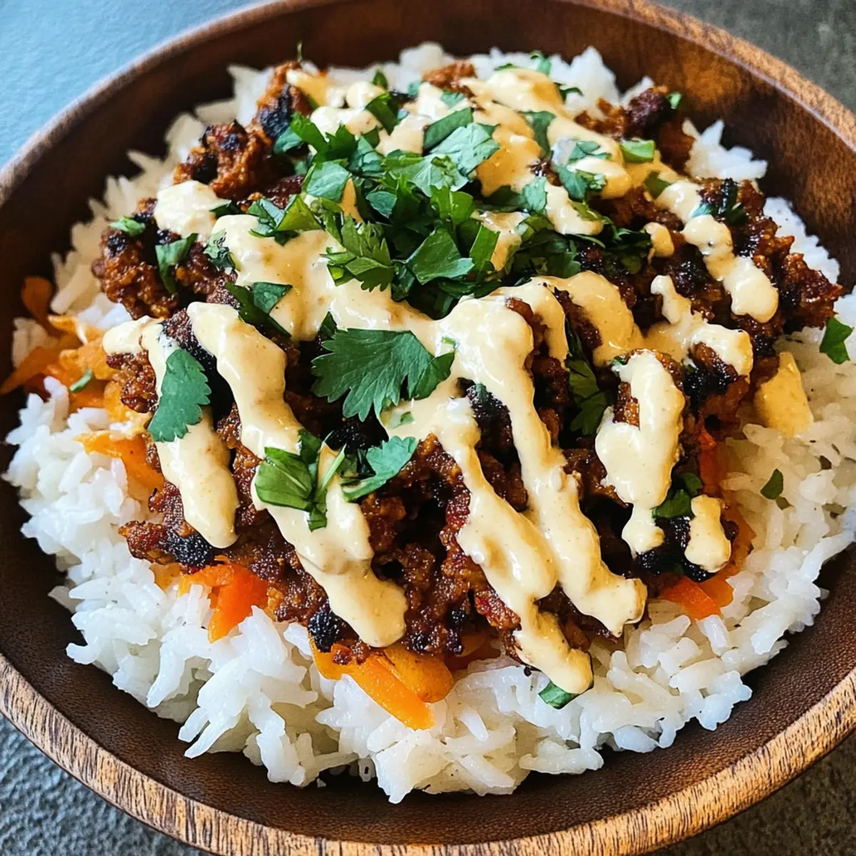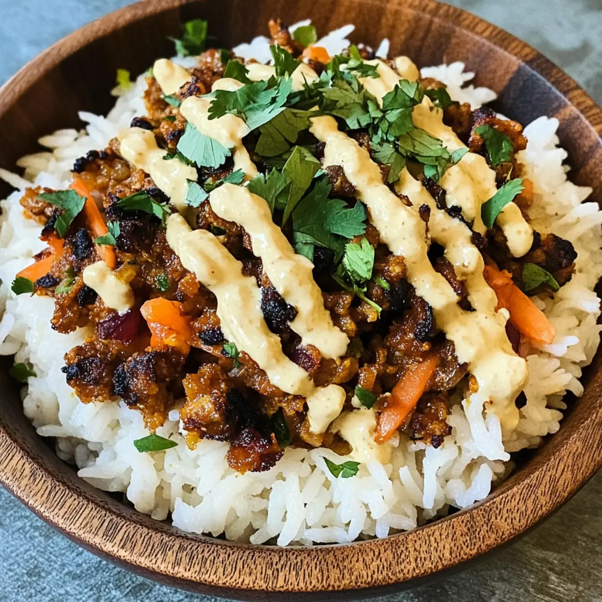 While the meat mixture cools slightly, prepare the sauce. In a small bowl, combine the remaining garam masala with mayo and your preferred amount of hot sauce. Mix thoroughly until smooth, enhancing the sauce with a bit of warmth and creaminess that will complement your flavorful rice bowls nicely.