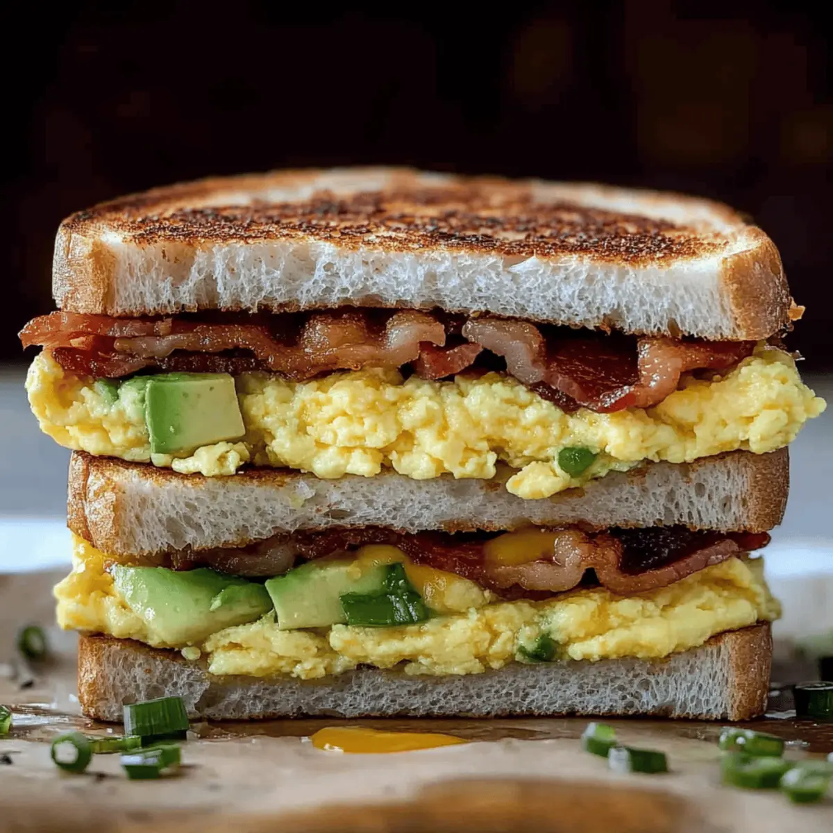 - Assemble your sandwich with a slice of bread, sautéed sausage, bacon, avocado, and scrambled eggs, topped with another slice of bread.