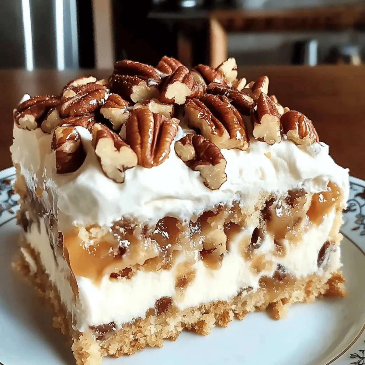Finally, refrigerate the Butter Pecan Praline Poke Cake for at least 2 hours before serving. This chilling time allows the flavors to meld together, enhancing the overall taste. Once ready to serve, slice into pieces and enjoy the blending of textures and rich, indulgent flavors in every bite.