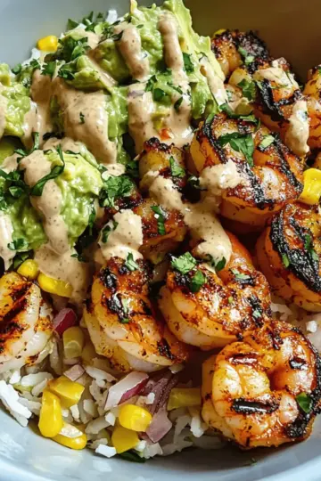 Grilled Shrimp Bowl with Avocado Corn Salsa & Creamy Sauce Bliss
