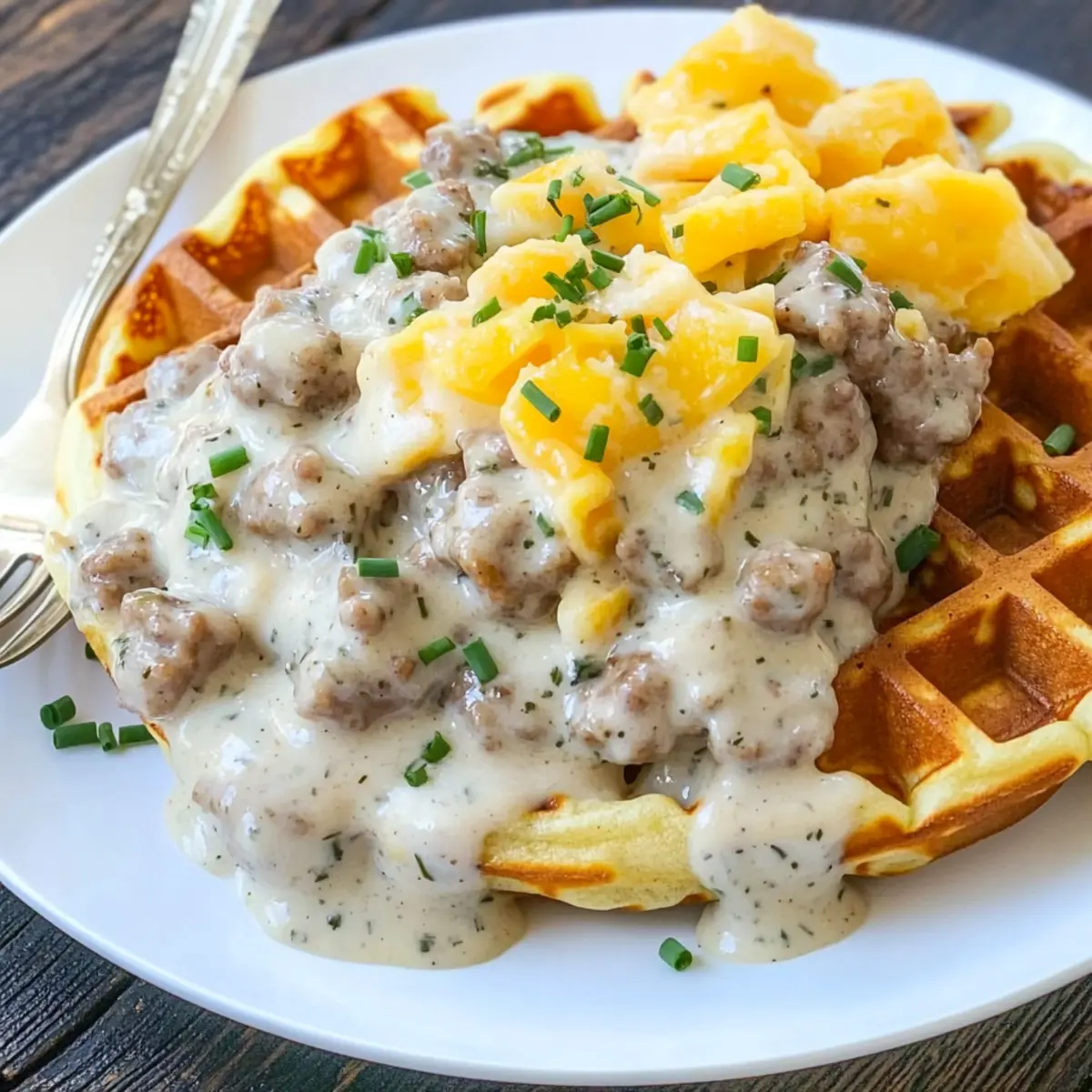 This recipe contains sausage in the gravy, making it unsuitable for vegetarians. However, you can easily adapt the recipe by making a mushroom or vegetable gravy instead. Just sauté your favorite veggies with seasonings and use them as a topping to create a delicious vegetarian option that complements the waffles beautifully!