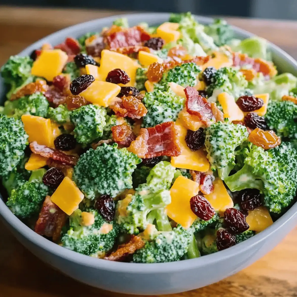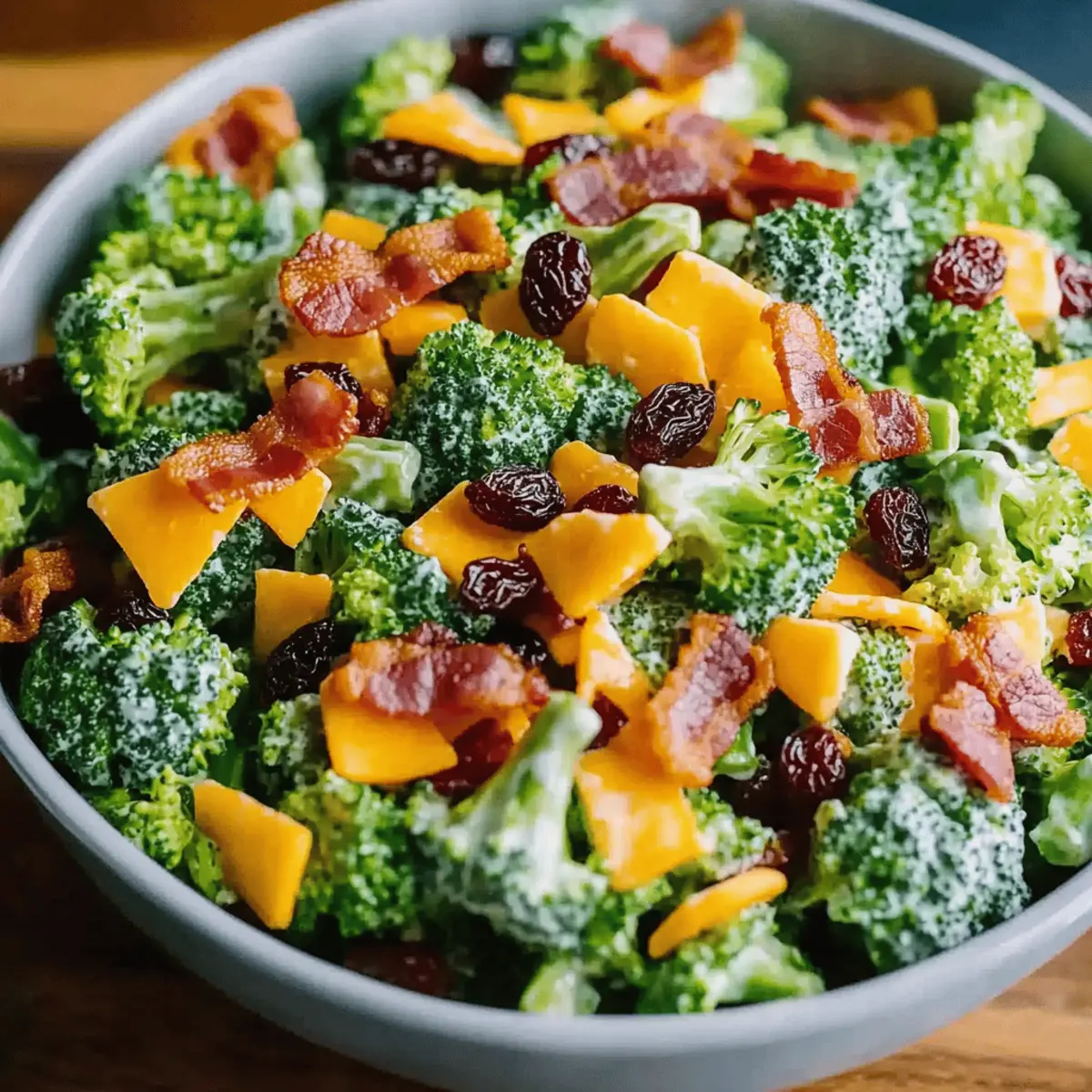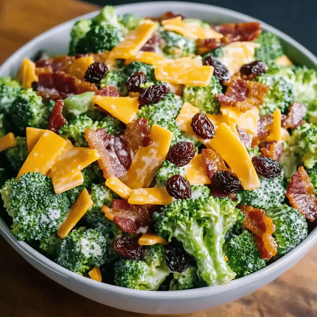 Classic Broccoli Bacon Salad with Sweet Raisins and Cheddar