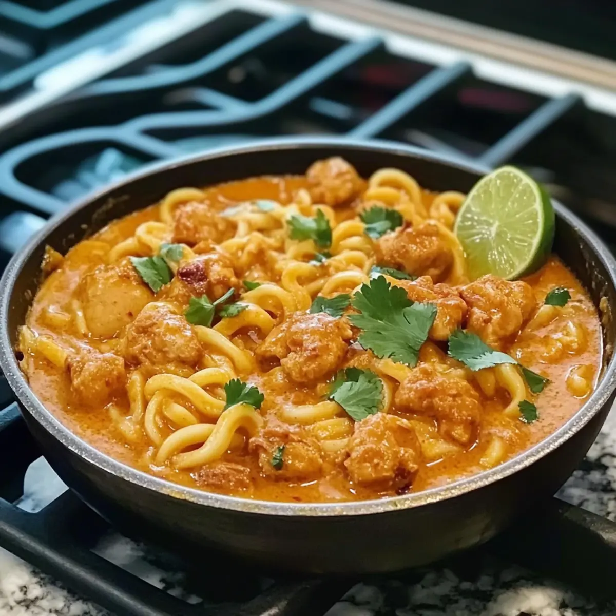 Taste the Coconut Red Curry Chicken Udon and adjust seasoning as needed, adding more salt, pepper, or curry paste for an extra kick. Serve in bowls, garnished with lime wedges, chopped cilantro, and a sprinkle of red chili flakes for that final touch of freshness and heat.