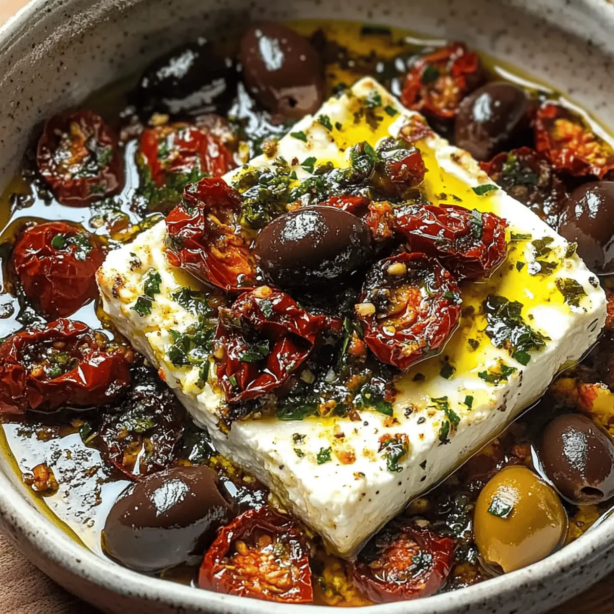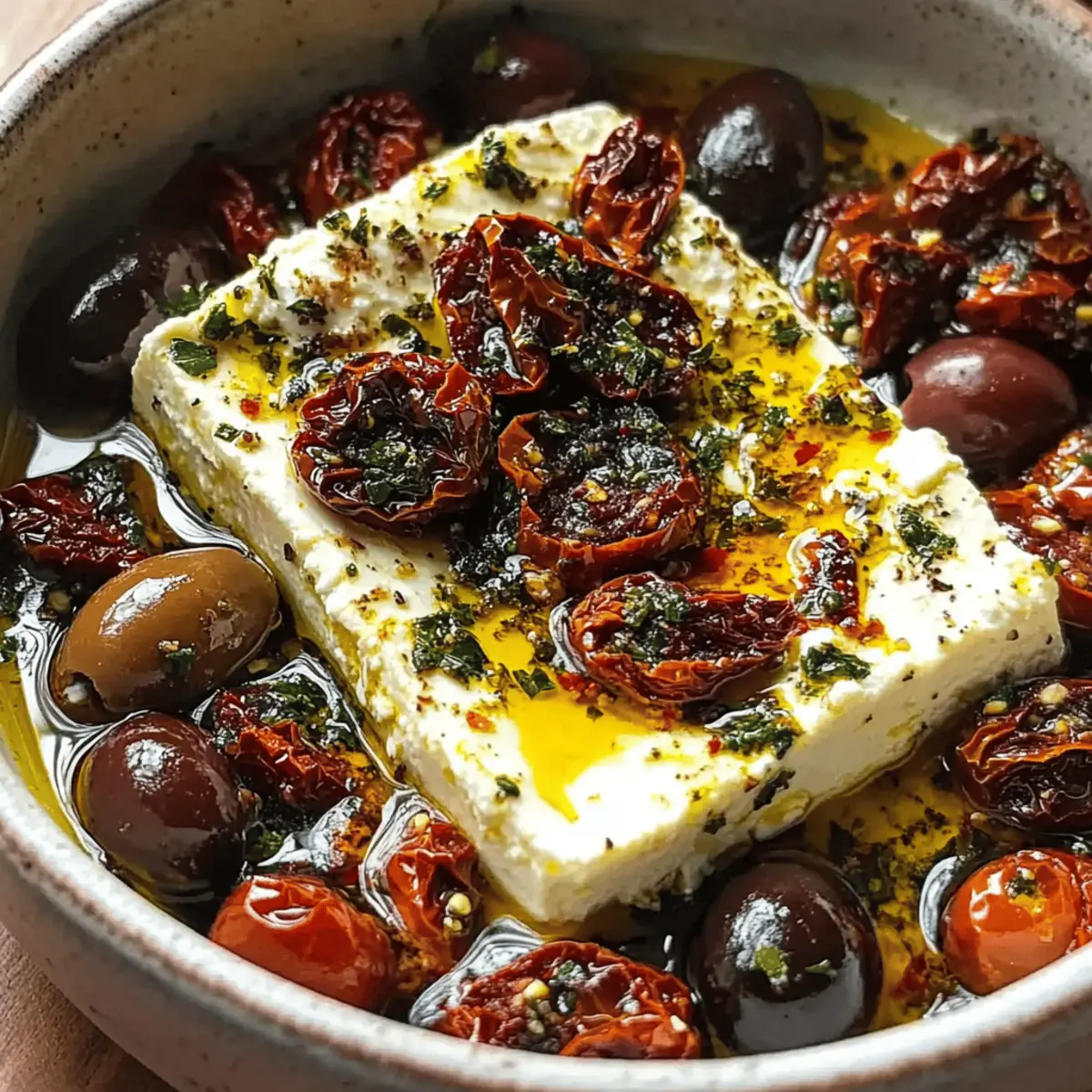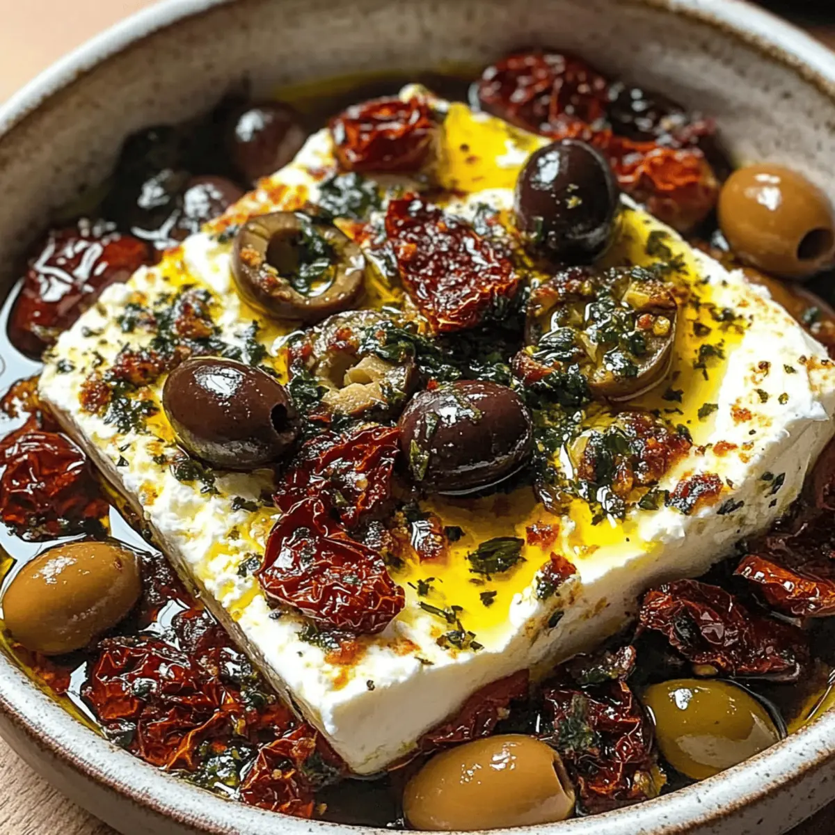 - In a medium-sized baking dish, place the block of creamy feta at the center. Surround it with olives, sun-dried tomatoes, and minced garlic. Drizzle with olive oil and sprinkle dried herbs over the top.