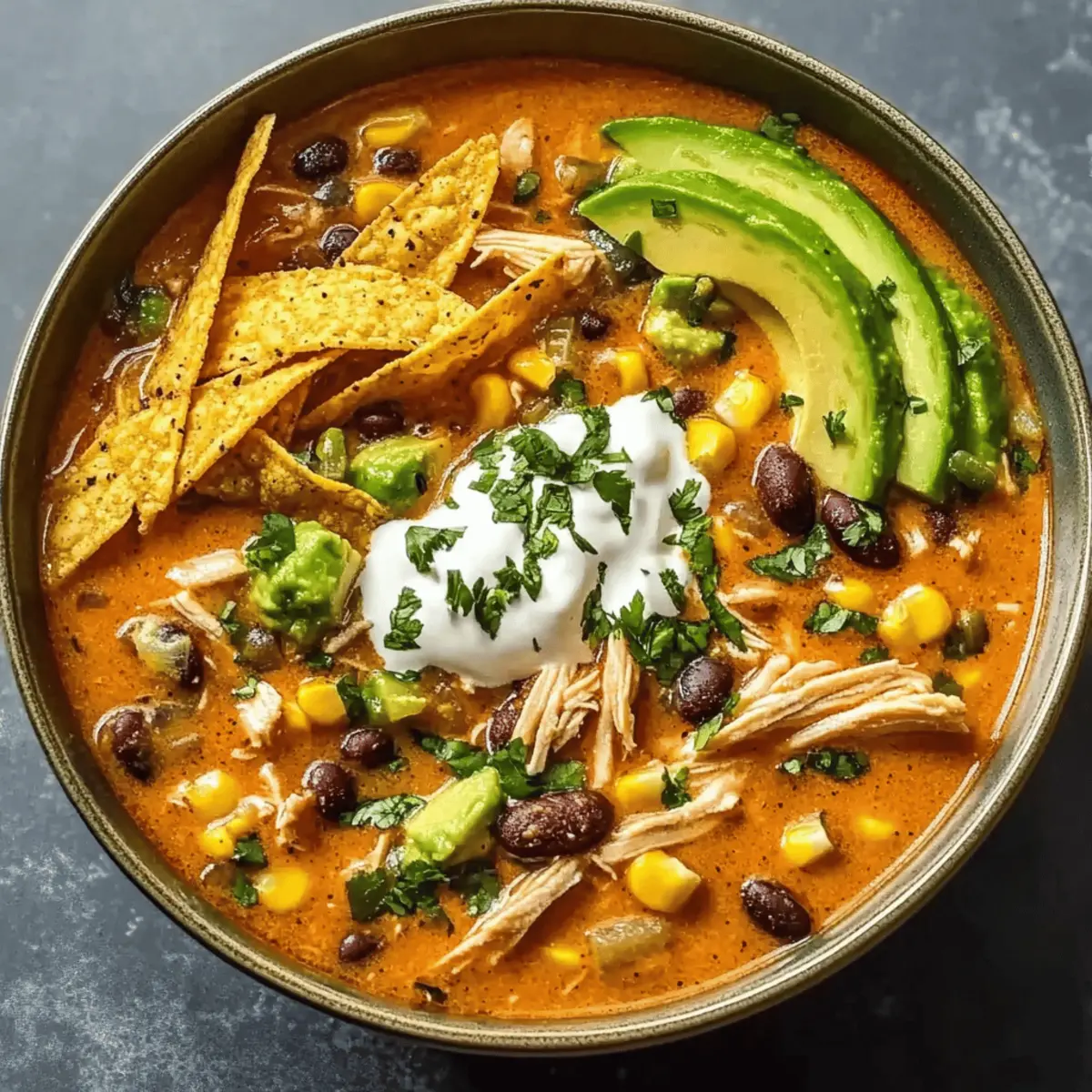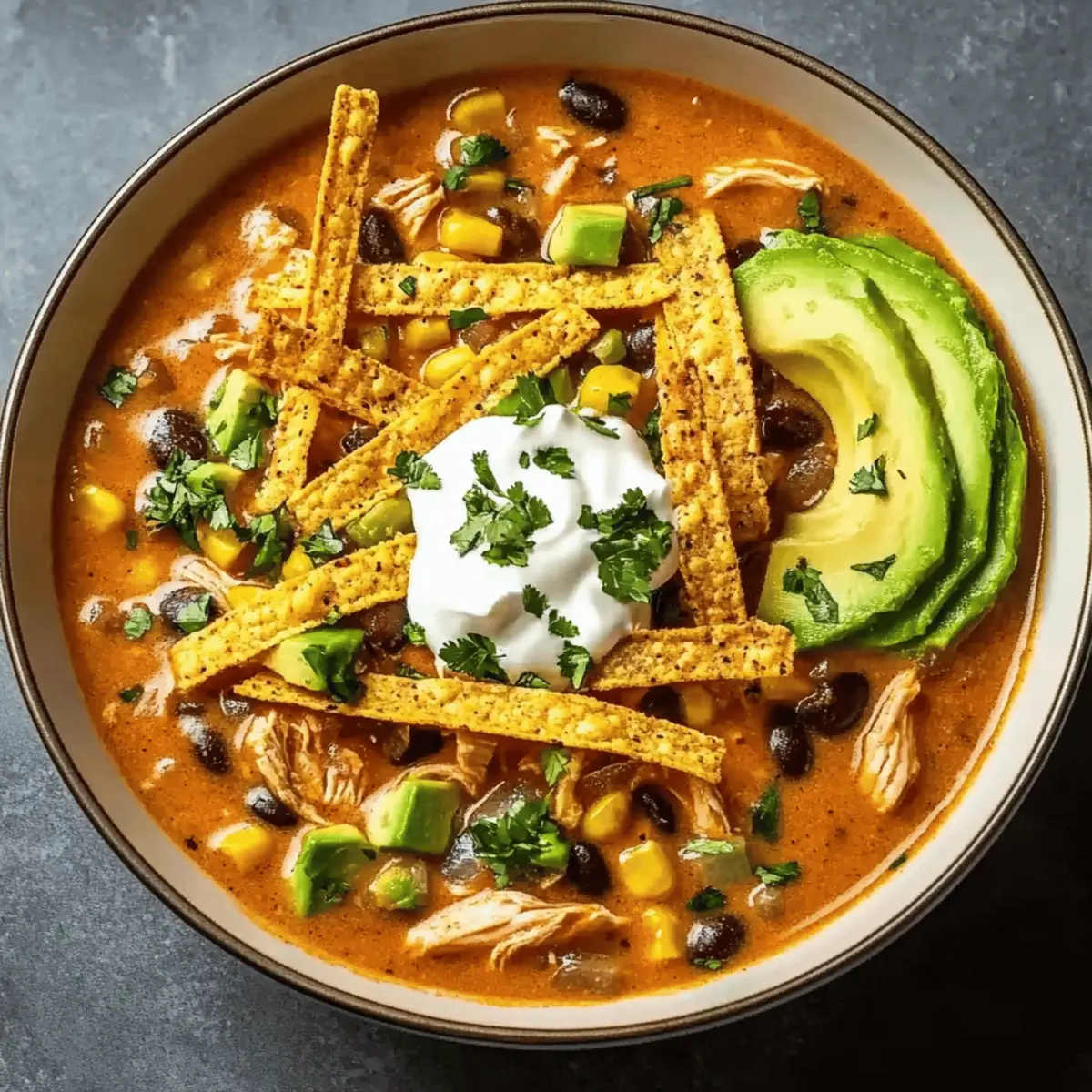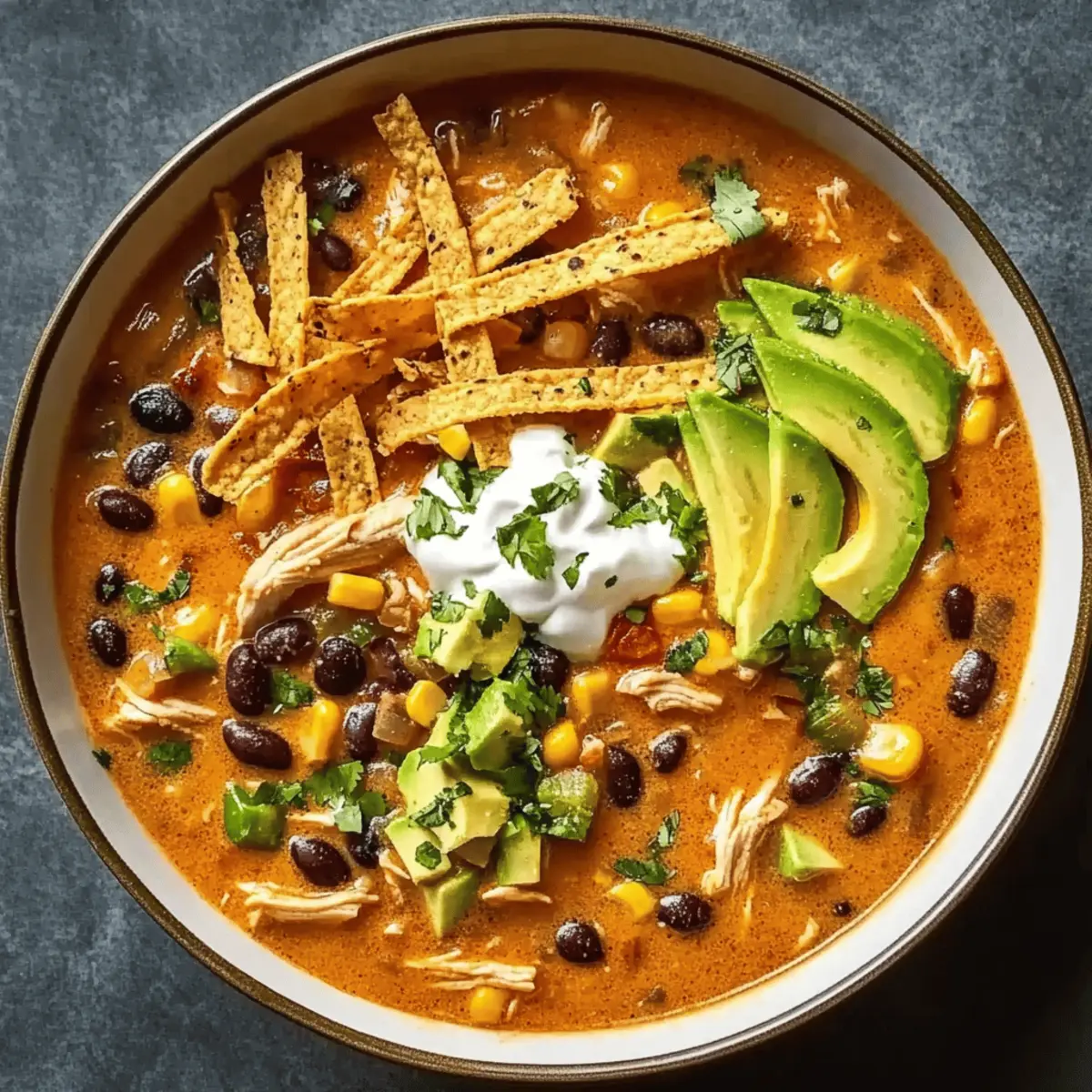 Ladle the steaming soup into bowls and generously top each serving with your prepared toppings—crunchy tortilla strips, creamy avocado, and a dollop of sour cream. The beautiful contrast of colors and textures creates an inviting presentation that will have everyone eager to dig in. Enjoy each spoonful of your wholesome Creamy Chicken Tortilla Soup!