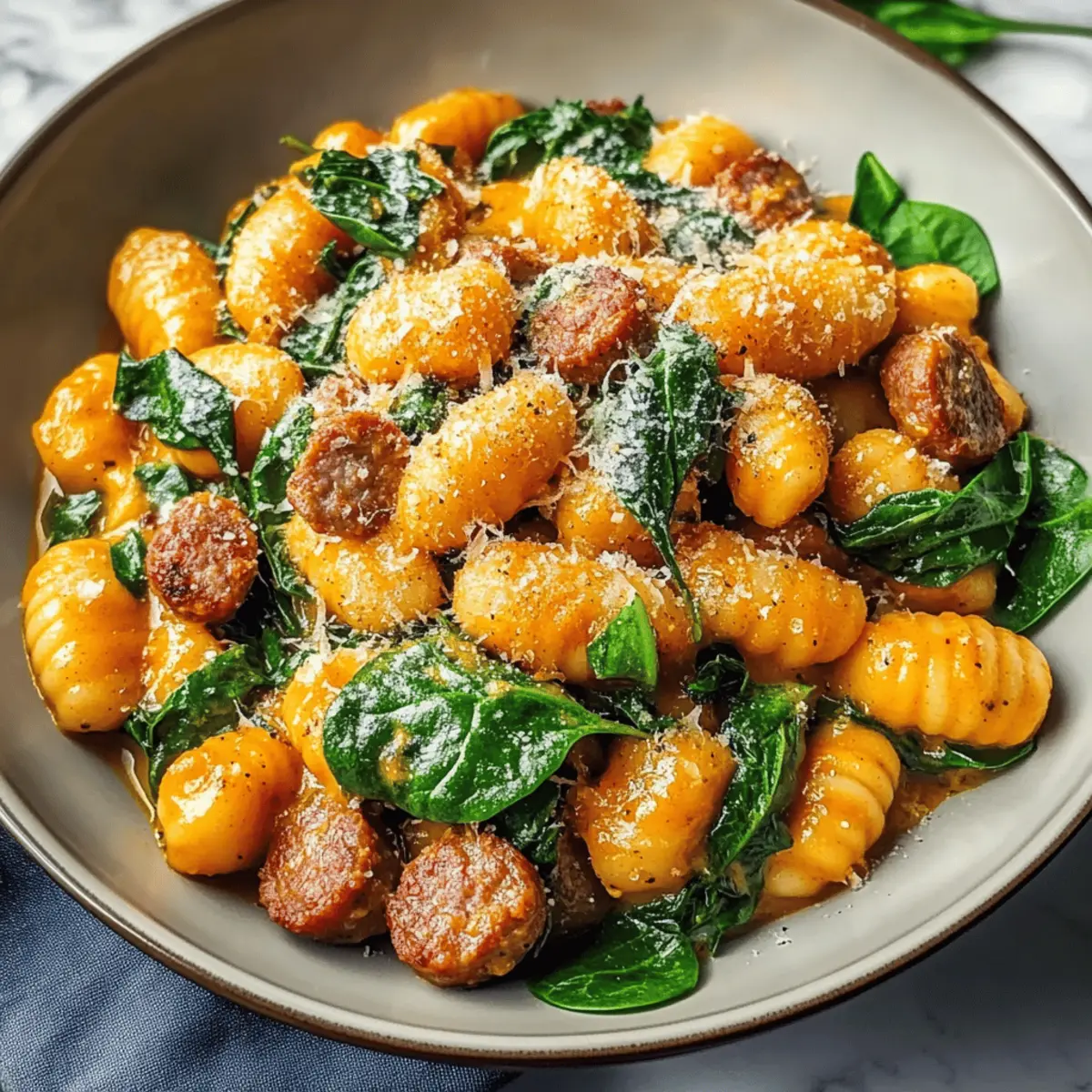 - Fold in the cooked gnocchi and fresh spinach into the sauce until the spinach wilts, about 1-2 minutes.