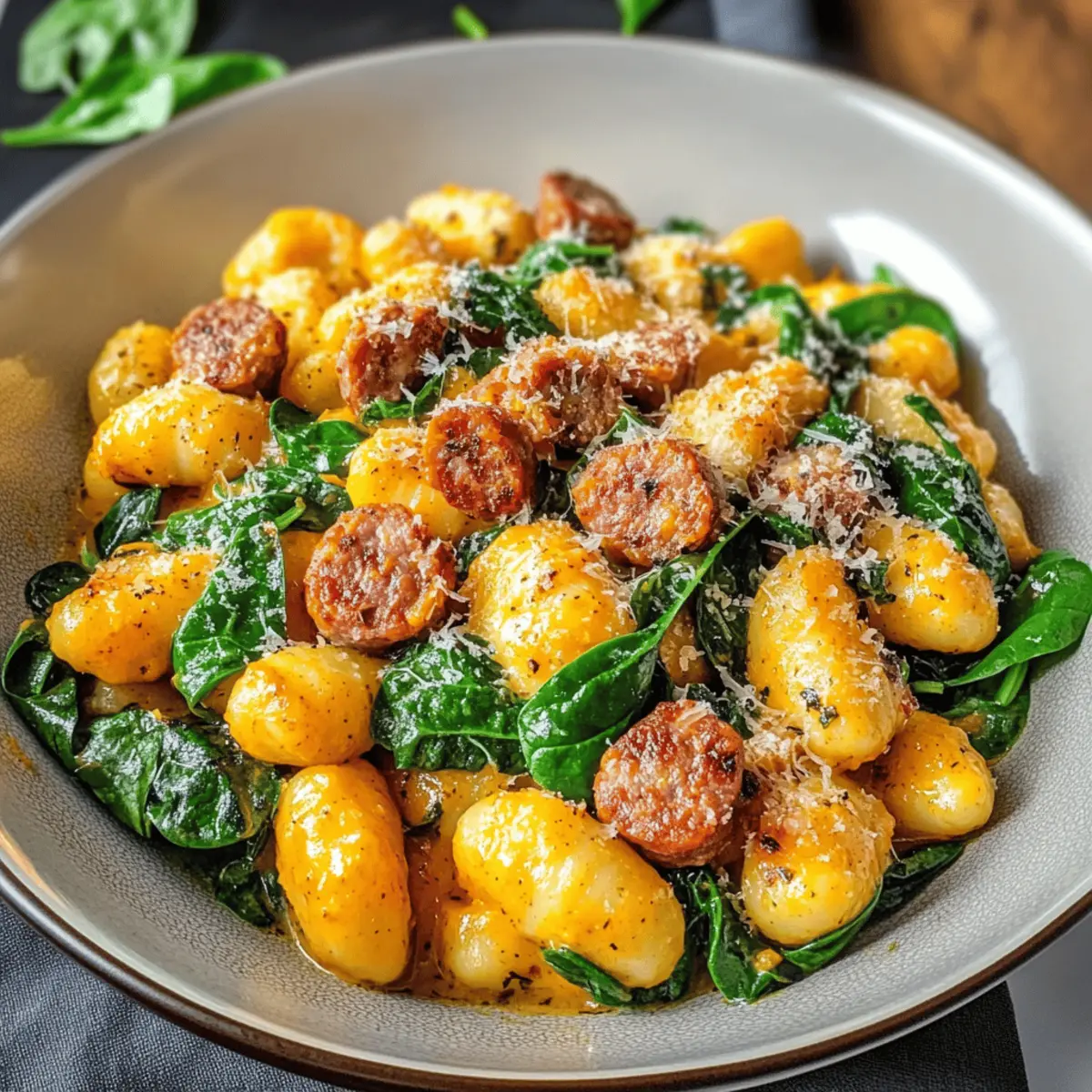 Gently fold the cooked gnocchi into the creamy pumpkin sauce, making sure to coat them evenly. Add the fresh spinach and stir just until the leaves wilt, which should take about 1-2 minutes. The vivid green of the spinach alongside the rich orange of the sauce makes this creamy pumpkin gnocchi truly inviting.