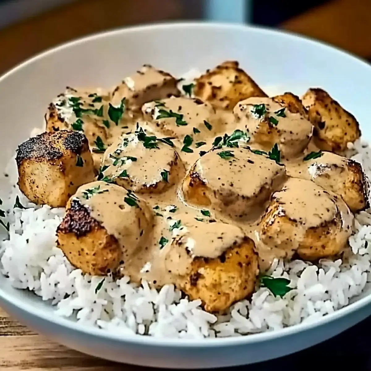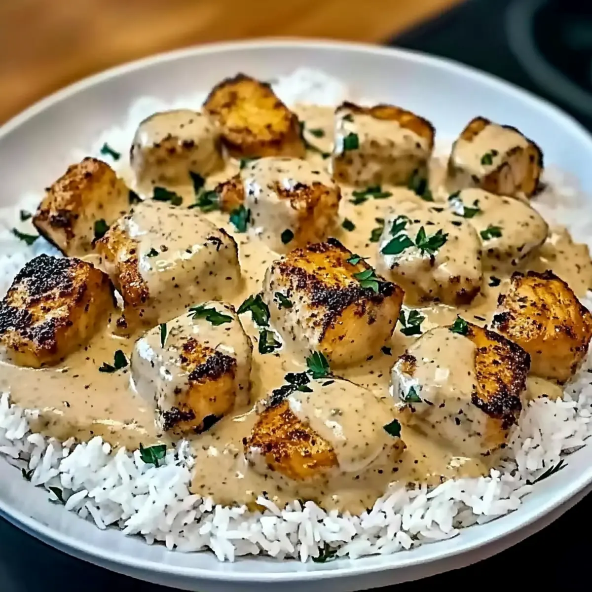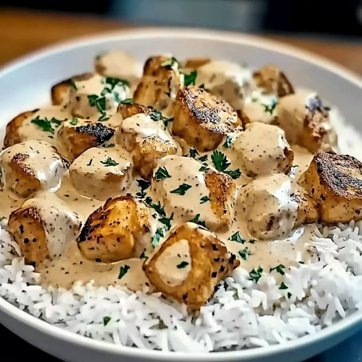 - Spoon the creamy chicken mixture over a bed of warm, fluffy cooked white rice. Garnish with chopped fresh parsley and serve immediately.
