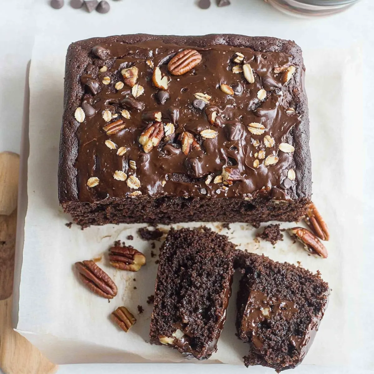 Pour the batter into your prepared baking pan, spreading it evenly using a spatula. Top the batter with the remaining chocolate chips and chopped pecans for extra deliciousness. This layer adds both visual appeal and crunch, ensuring every bite of your Devil's Food Snack Cake is a treat.