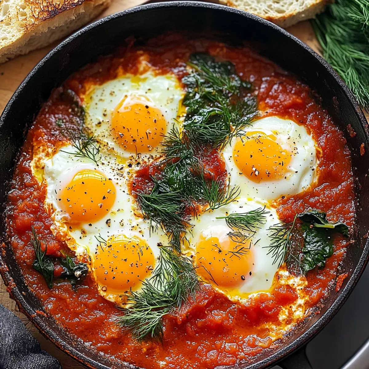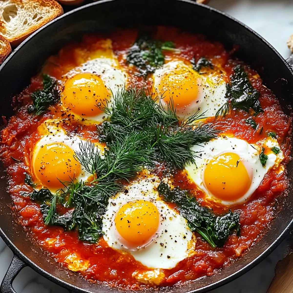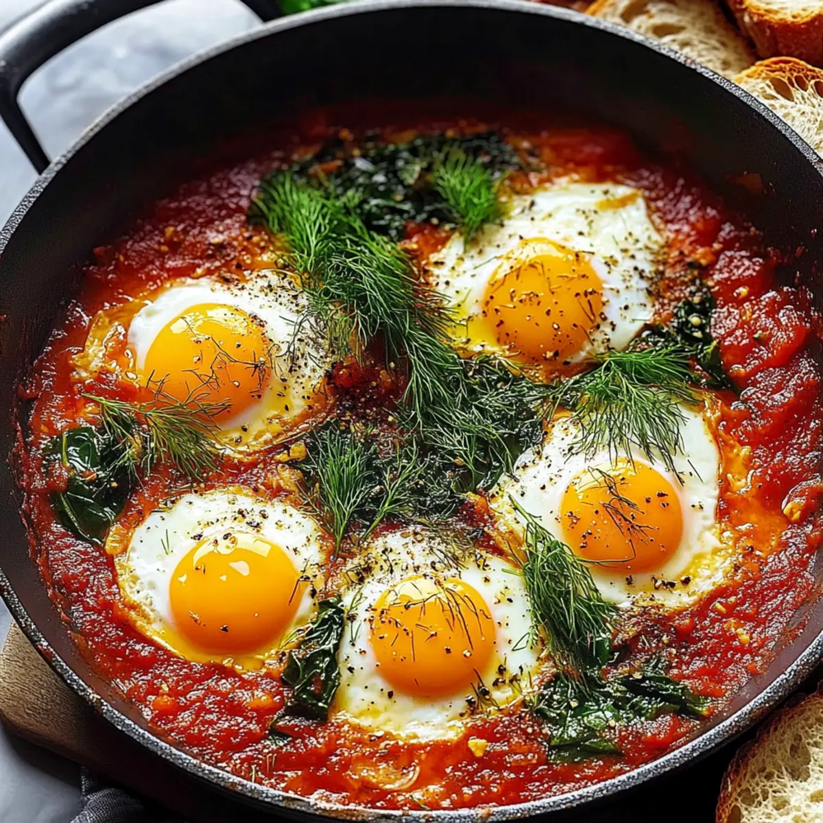 Once the eggs are cooked to your liking, remove the skillet from heat. Serve the dish hot, topped with fresh dill and a sprinkle of optional Parmesan cheese for an added nutty flavor. Accompany your vibrant Eggs in Purgatory with those golden toasted bread slices for a satisfying brunch experience that's sure to impress.