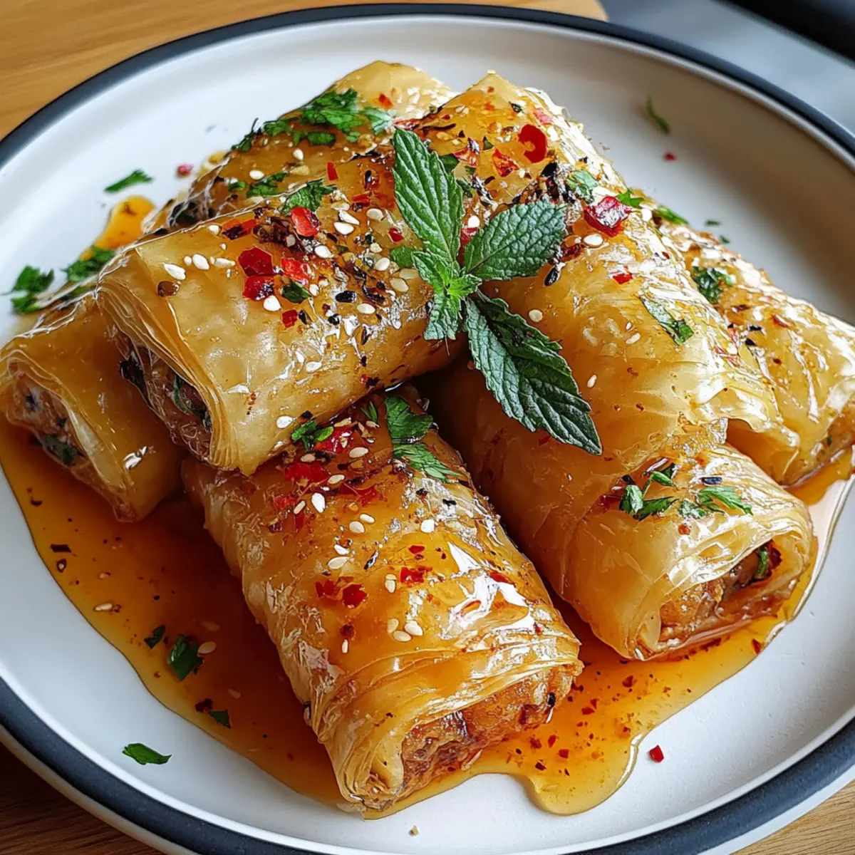 Once baked, remove the rolls from the oven and drizzle the warm chili honey generously over them. The combination of the crispy feta rolls with the sweet and spicy chili honey creates a perfect harmony of flavors, making them a truly delicious appetizer to enjoy!
