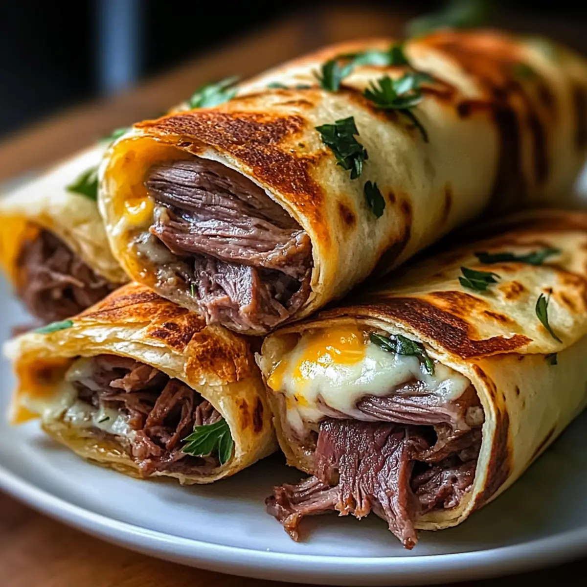 - Lay a flour tortilla flat, layer warm roast beef and shredded cheese, then roll up tightly and place seam-side down on a plate.