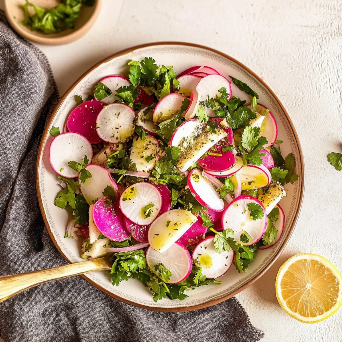 To enhance the presentation and flavor, garnish your Fresh Radish and Herb Salad with a handful of fresh basil leaves and a few lemon slices arranged beautifully on top. This vibrant addition not only elevates the dish visually but also complements the salad's zesty notes. Serve immediately to enjoy the crispness, or refrigerate briefly if needed, but it’s best enjoyed fresh!