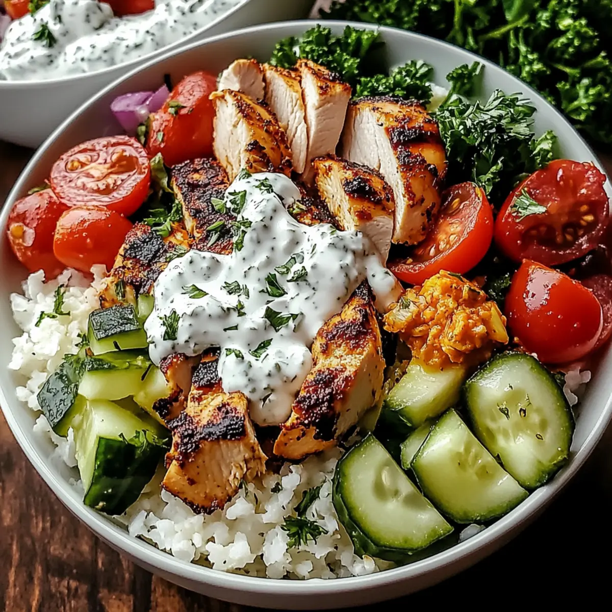 Start by layering a hearty base of cooked rice or cauliflower rice in each bowl. Next, arrange the sliced chicken on top in a visually appealing manner. Then add halved cherry tomatoes, diced cucumbers, thinly sliced red onion, Kalamata olives, and crumbled feta cheese. This creates a colorful and inviting centerpiece for your meal.