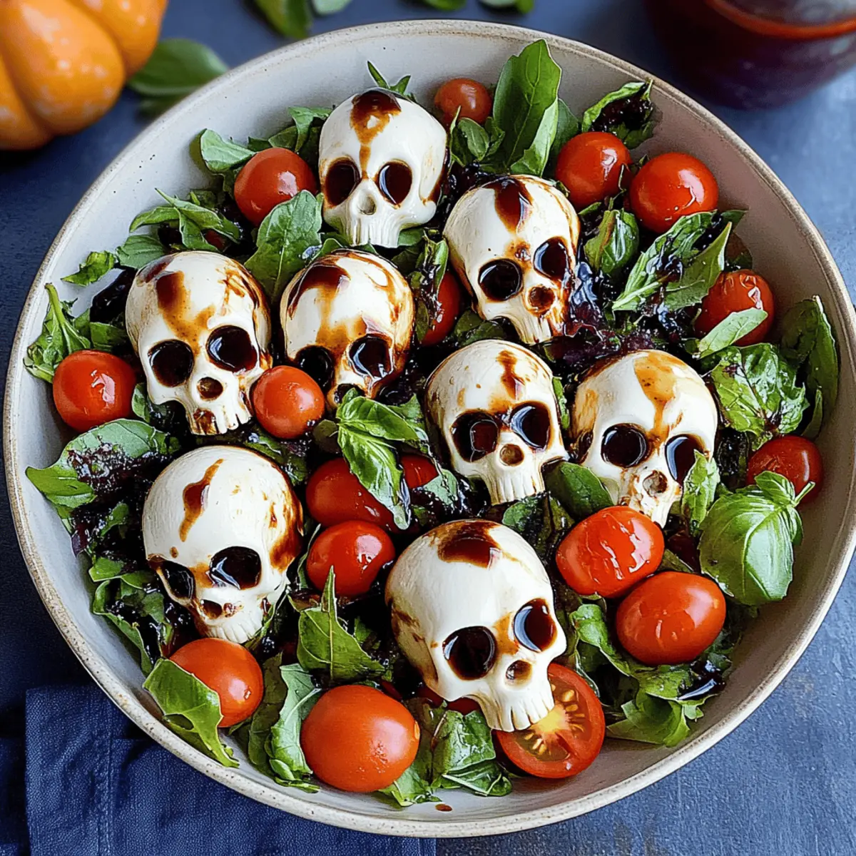 Festive Fun: This Spooky Halloween Salad is a delightful way to celebrate, featuring charming skull-shaped mozzarella that will impress guests of all ages.