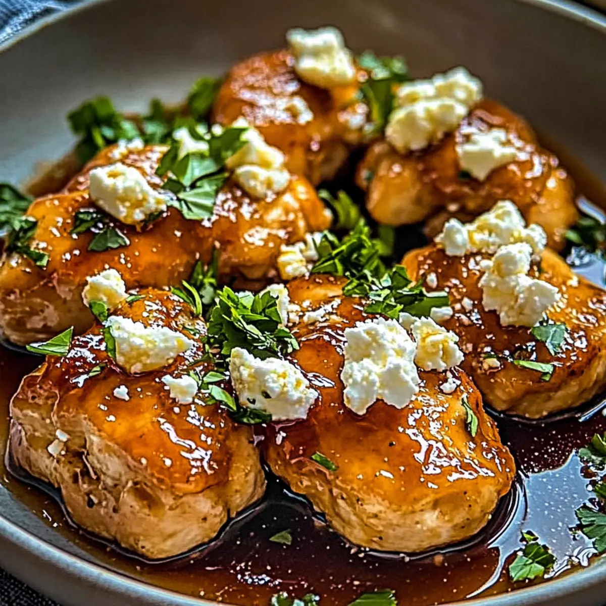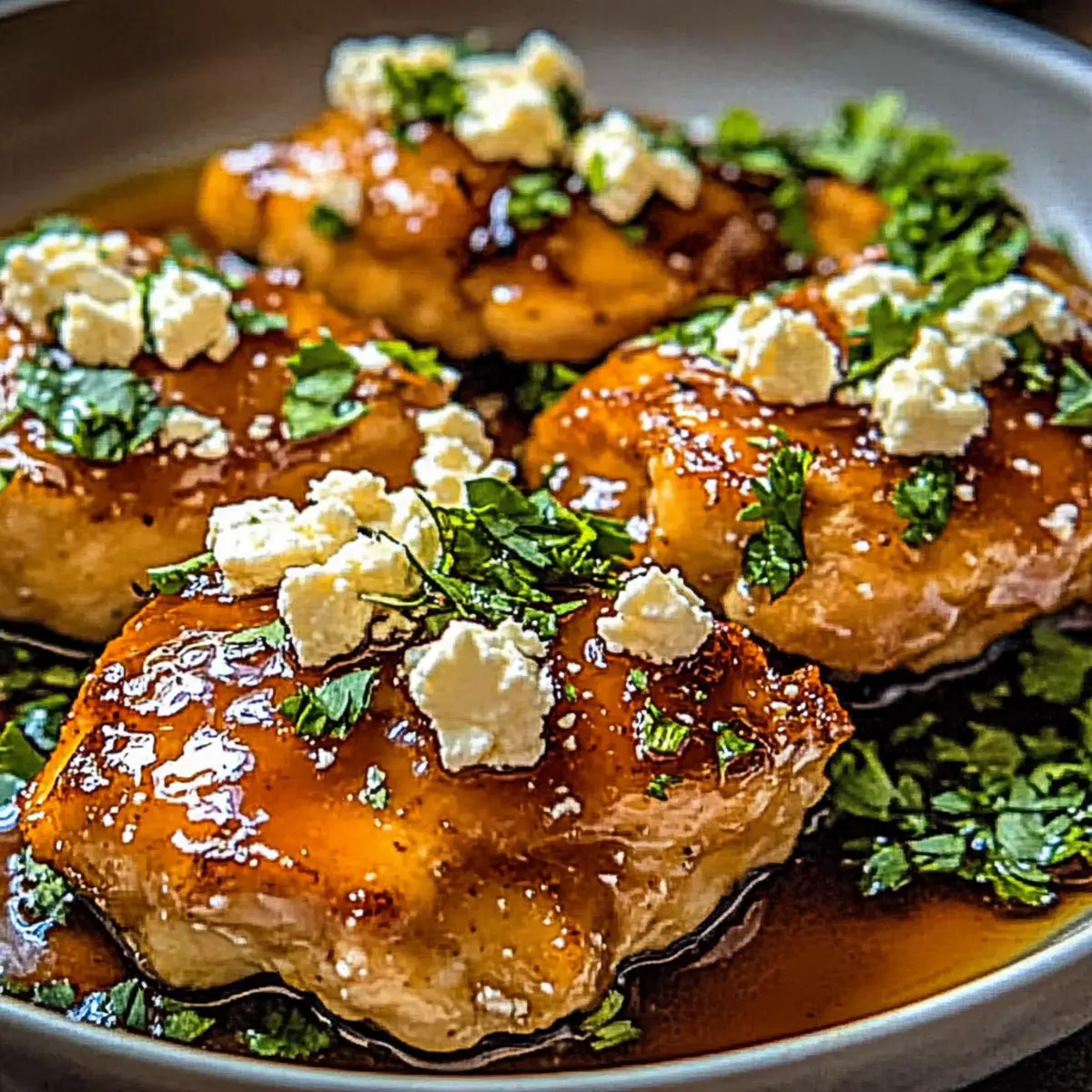 - After cooking, pour the hot honey sauce over the chicken and sprinkle with crumbled feta. Allow to rest for a few minutes to meld the flavors.