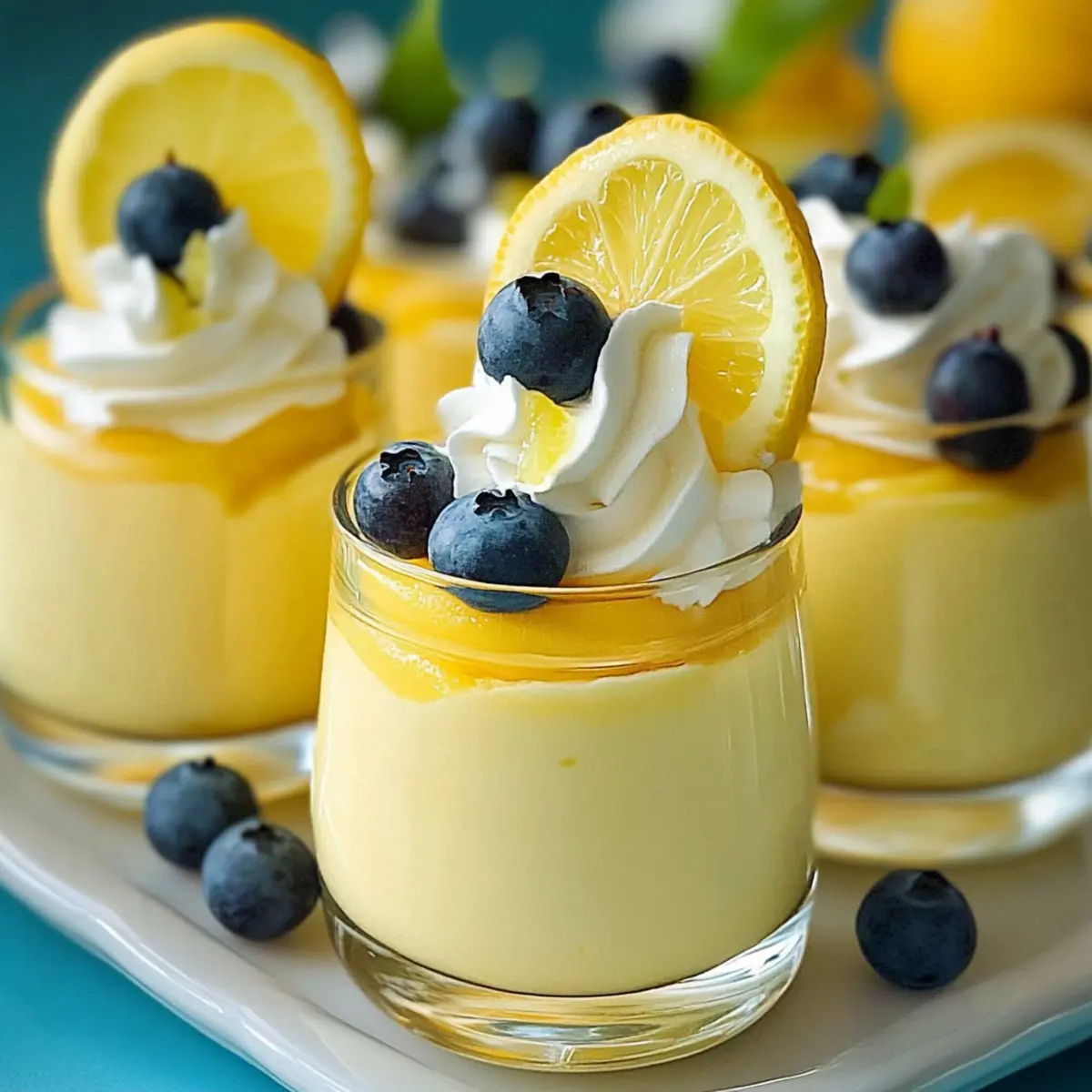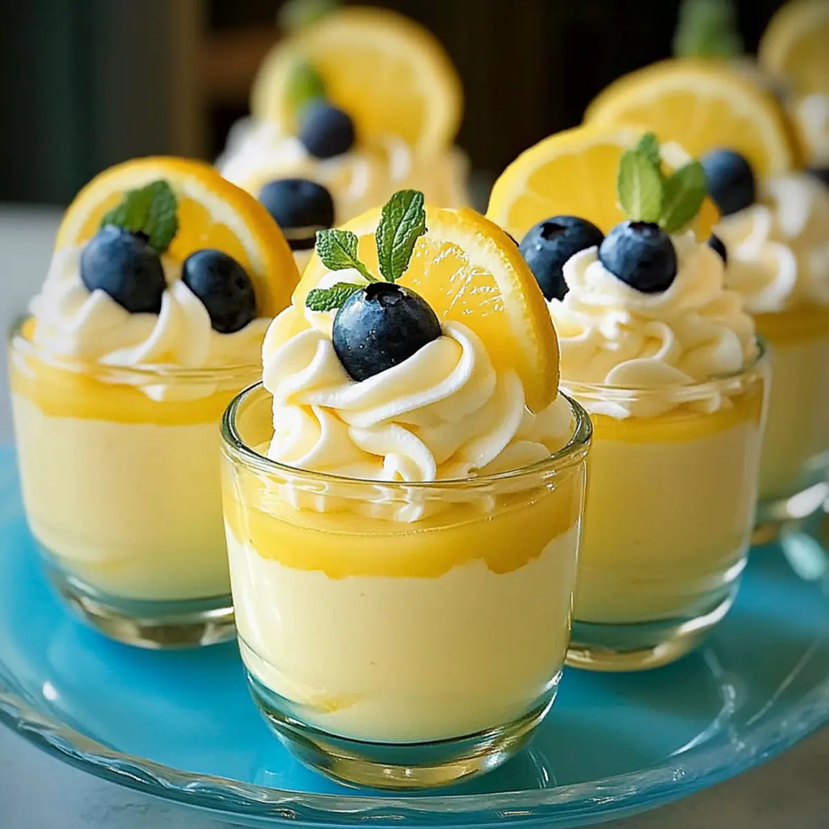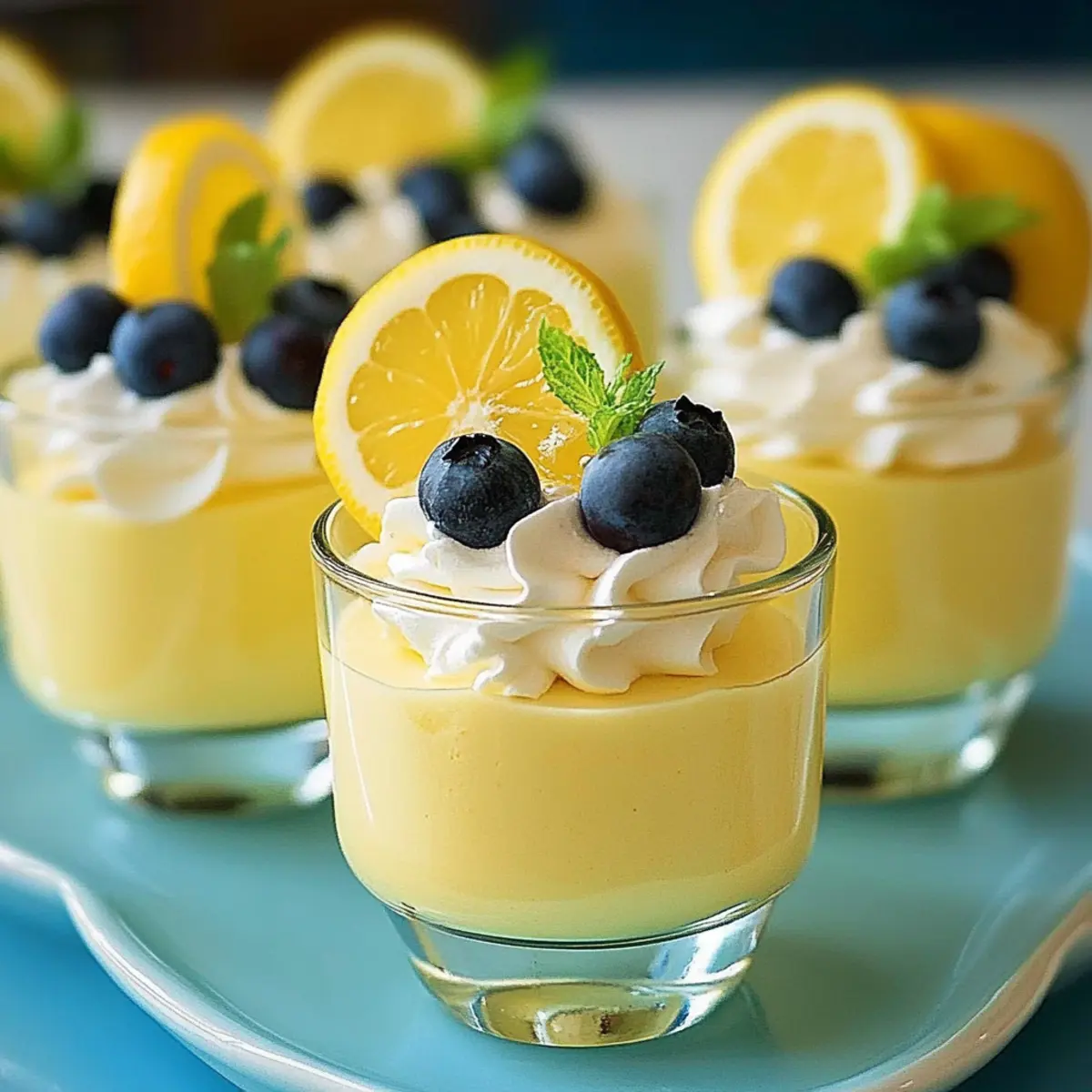 Once set, remove the Lemon Cheesecake Mousse from the refrigerator. Top each serving with a dollop of sweetened whipped cream, a fresh lemon wedge, a few blueberries, and a sprig of mint for a touch of color and freshness. Serve chilled, and let the tart yet creamy flavors delight your guests!