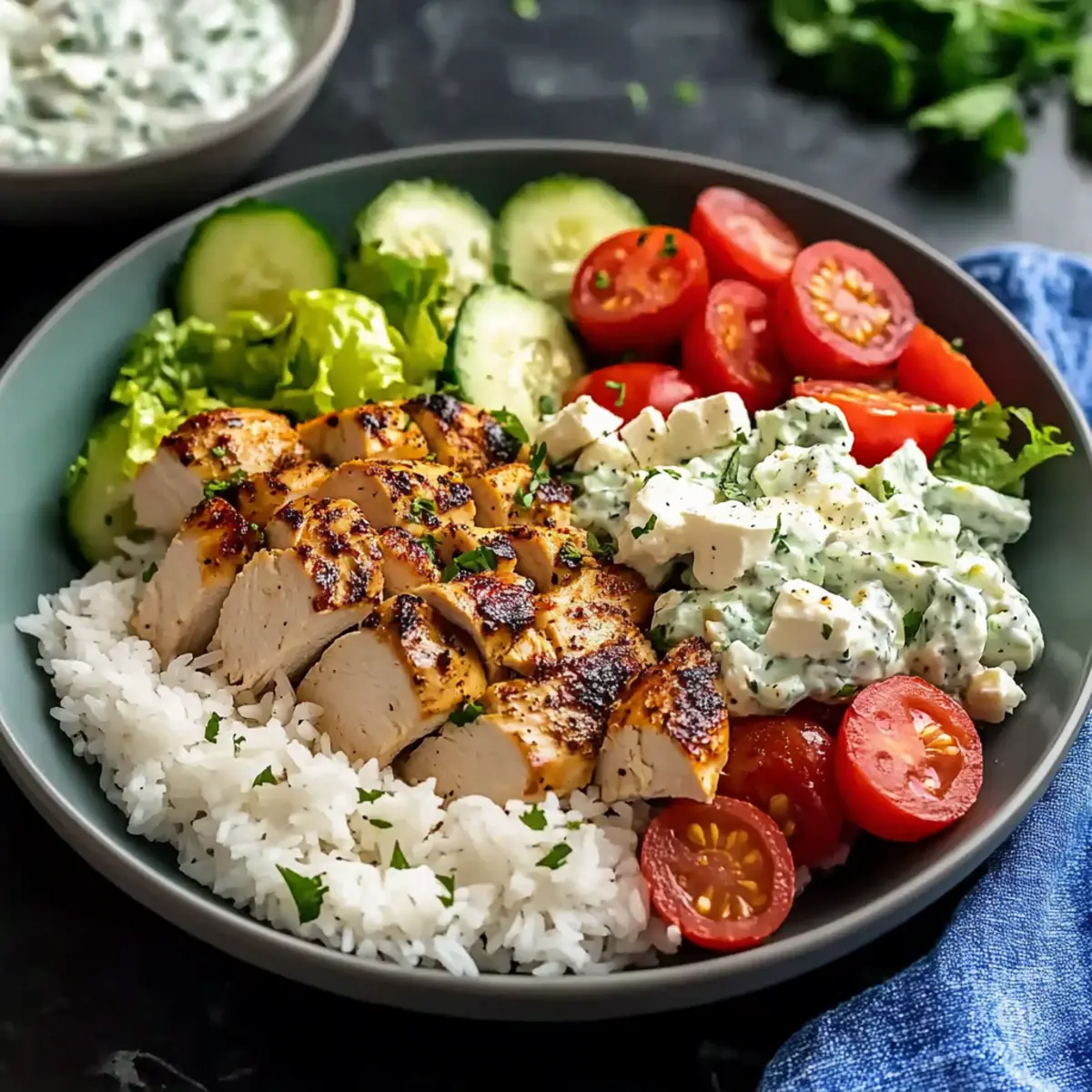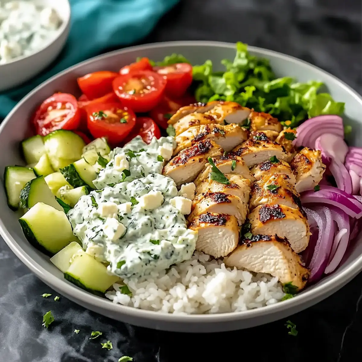 - Assemble bowls with cooked rice, chopped vegetables, sliced chicken, and drizzle with tzatziki. Sprinkle with feta and parsley.