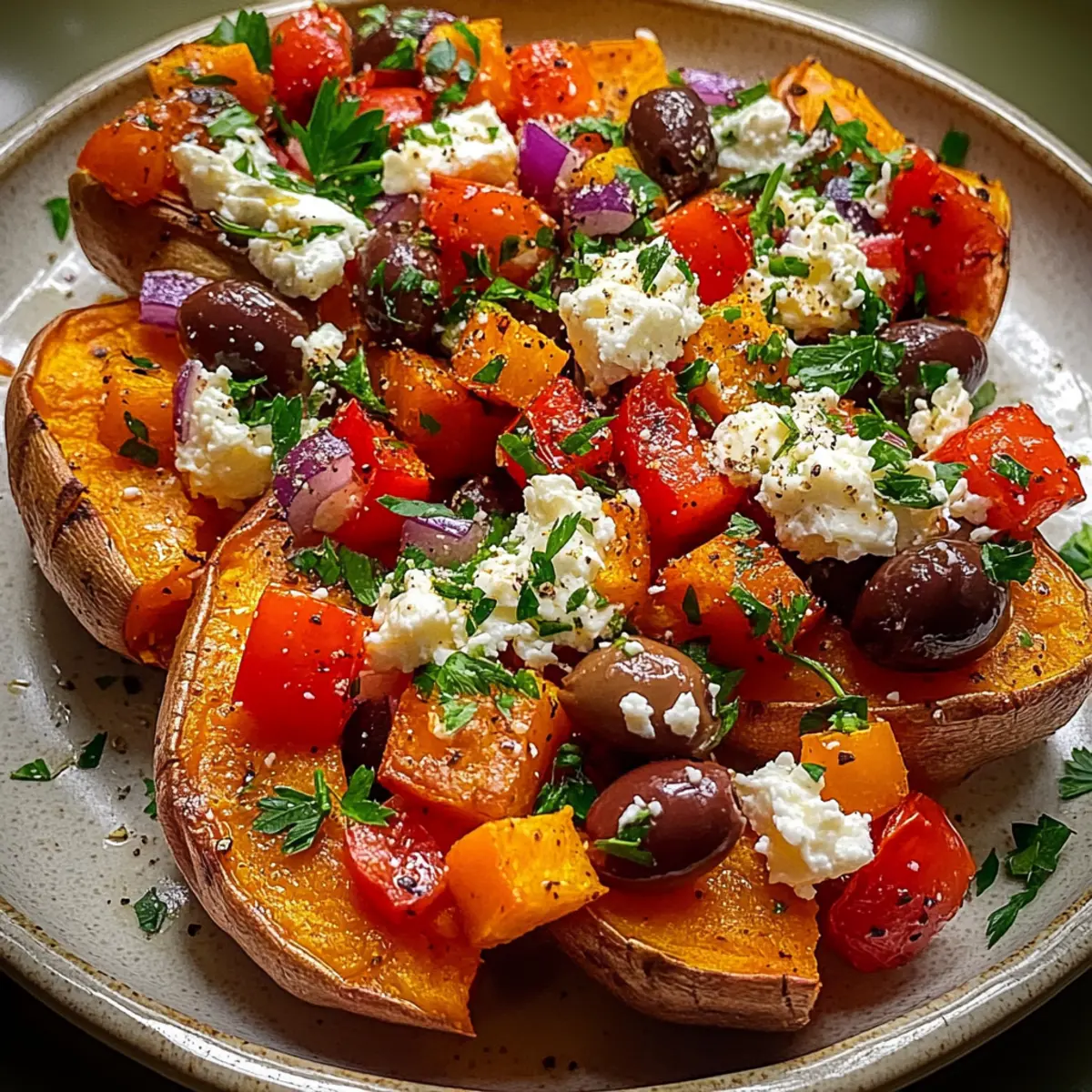 Place the roasted Mediterranean Sweet Potatoes on a serving platter, then generously spoon the colorful topping mixture over the warm sweet potatoes. The combination of textures and flavors will be visually appealing and utterly appetizing.