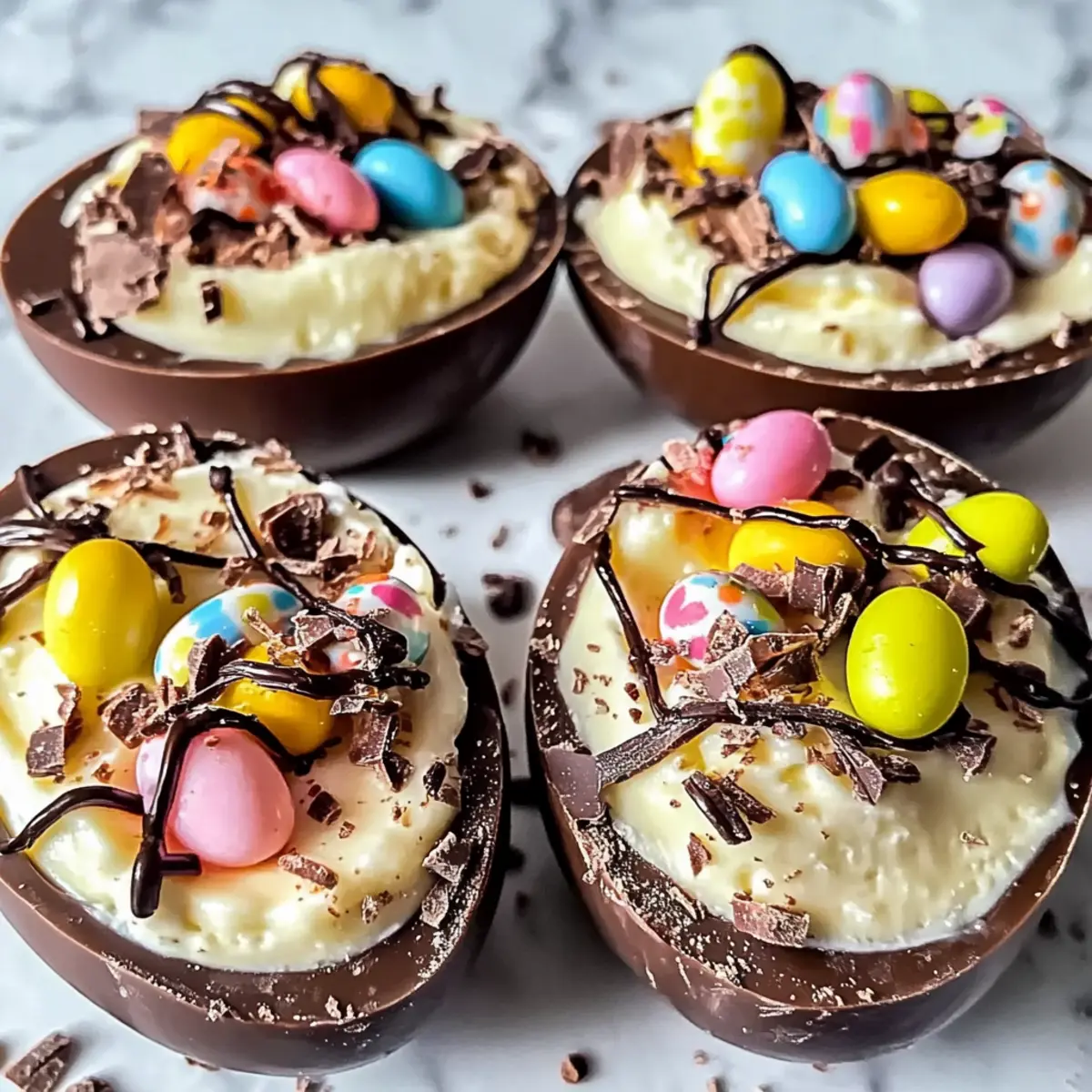 - Melt your choice of dark or milk chocolate in a microwave-safe bowl, then drizzle the melted chocolate over the filled egg shells. Sprinkle mini eggs or your selected chocolates over the top for a festive touch.