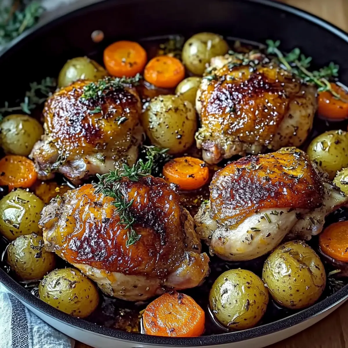 Flavor-packed dish: The succulent chicken thighs, combined with their crispy skin and the sweet, roasted vegetables, create an irresistible symphony of tastes that your family will adore.