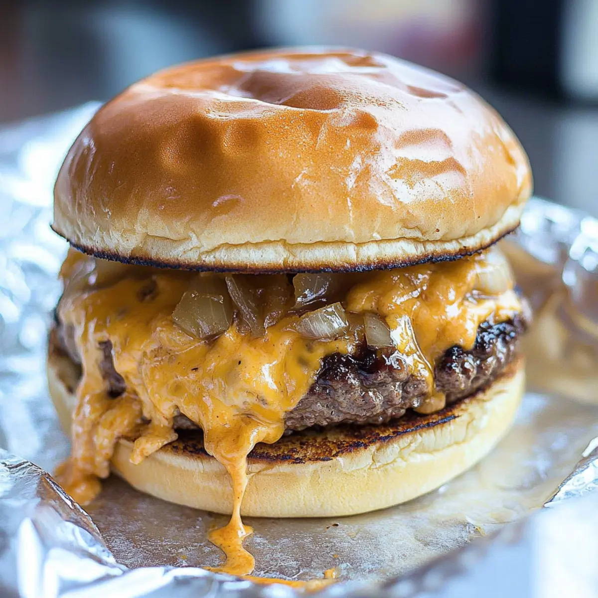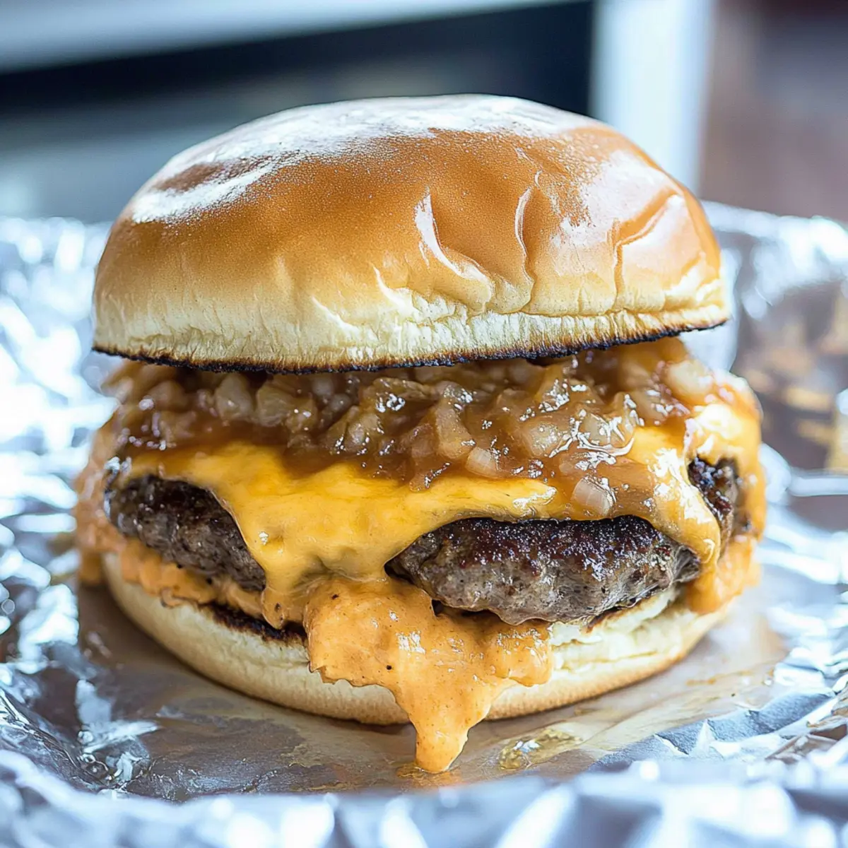 On a large piece of aluminum foil, begin layering your Oven Baked Burgers: start with the bottom bun, then add a slice of cheese, a seared patty, a few chopped sweet onions, and drizzle on 1-2 tablespoons of your secret sauce. Top it with another slice of cheese, and finish with the top bun. Wrap the sandwich securely in the foil to keep all those delicious flavors intact during baking.