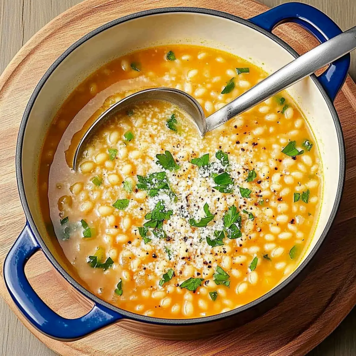 - Ladle the soup into bowls, top with remaining Parmesan cheese and minced parsley, finishing with a pinch of pepper.
