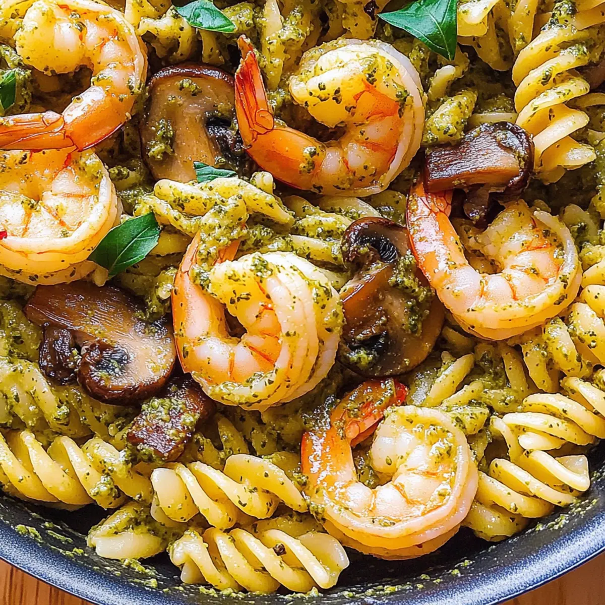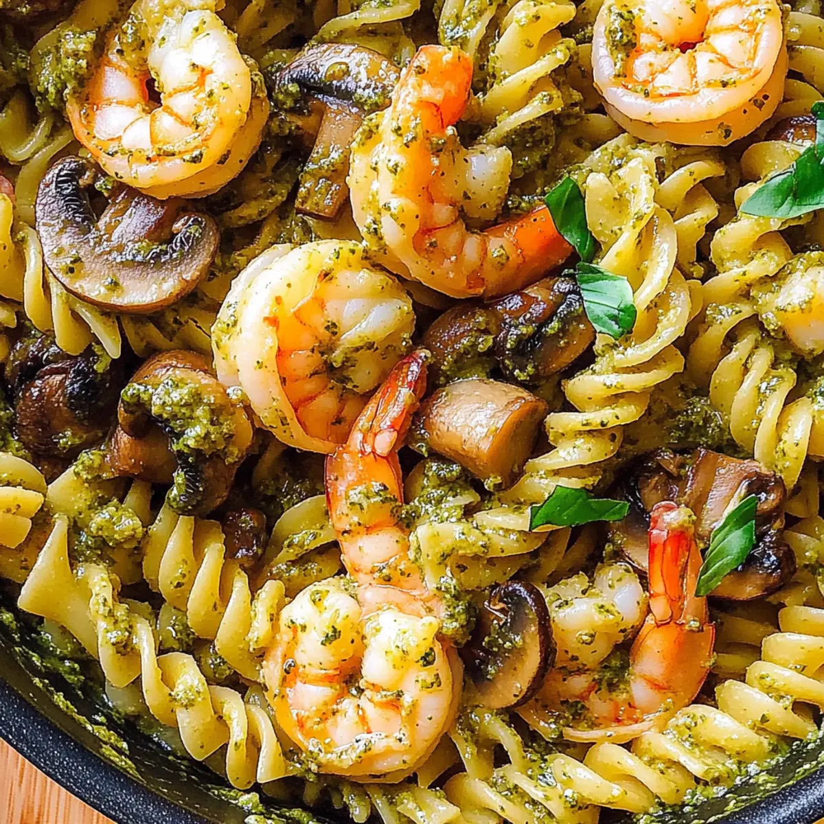 Flavor explosion: The basil pesto lends a rich, aromatic touch, while succulent shrimp and earthy mushrooms create a delightful medley of flavors.