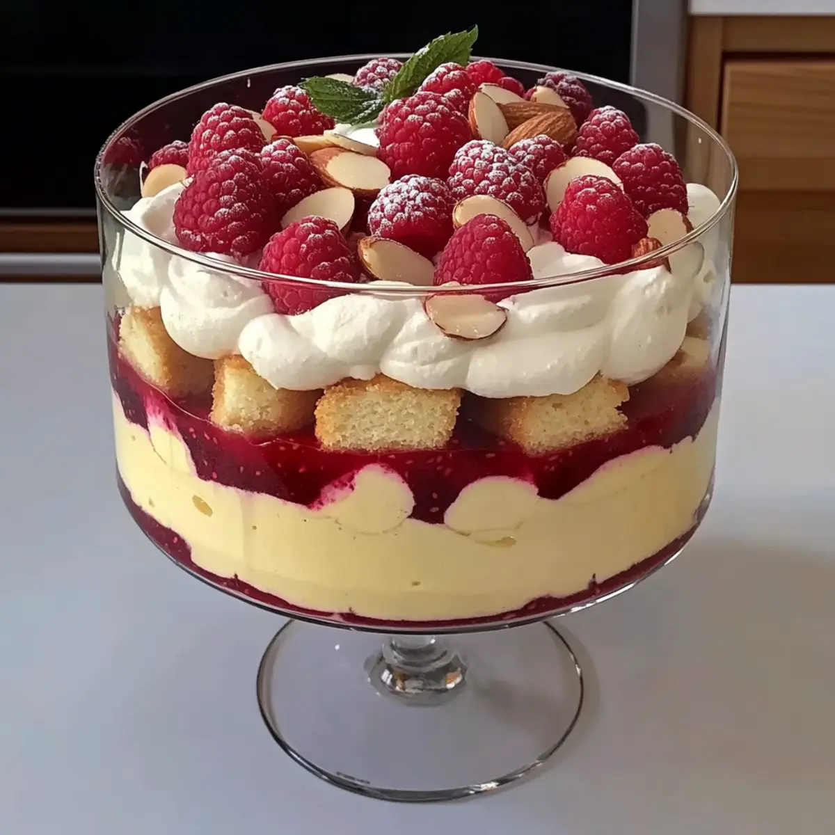 Sprinkle toasted almond slices generously over the top of your finished trifle for an extra crunch and nutty flavor. For a refreshing touch, garnish with fresh mint leaves, creating a lovely contrast against the dessert. Once assembled, chill the trifle in the refrigerator for at least one hour, allowing the flavors to meld beautifully and the cake to absorb moisture, enhancing the overall taste. Serve chilled and enjoy the delightful layers of your Raspberry and Almond Trifle!