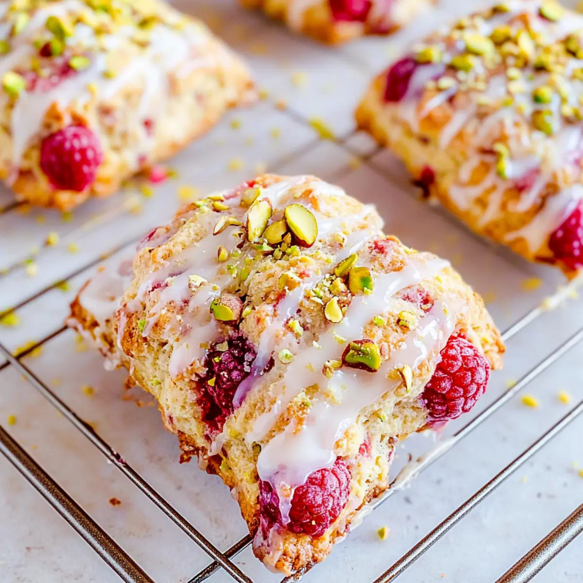 Once the scones are baked to a beautiful golden brown and have cooled on a wire rack for about 10 minutes, drizzle the lemon glaze generously over the tops. Optionally, sprinkle with ground pistachios for an extra touch. These Raspberry Pistachio Scones with Lemon Glaze are now ready to be enjoyed, perfect for a cozy snack or delightful tea time.
