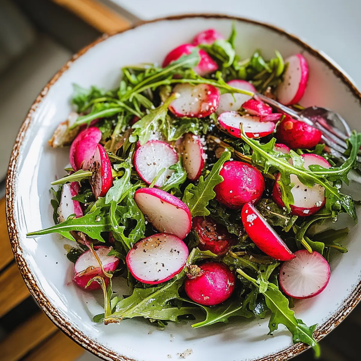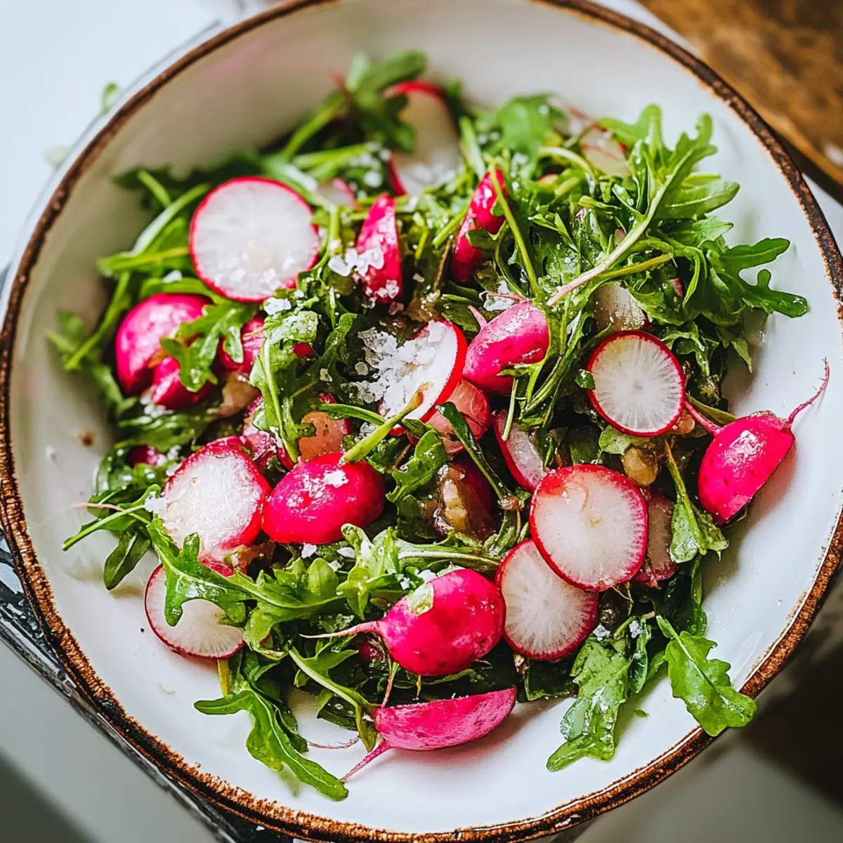 - Gently toss the radishes and arugula together.