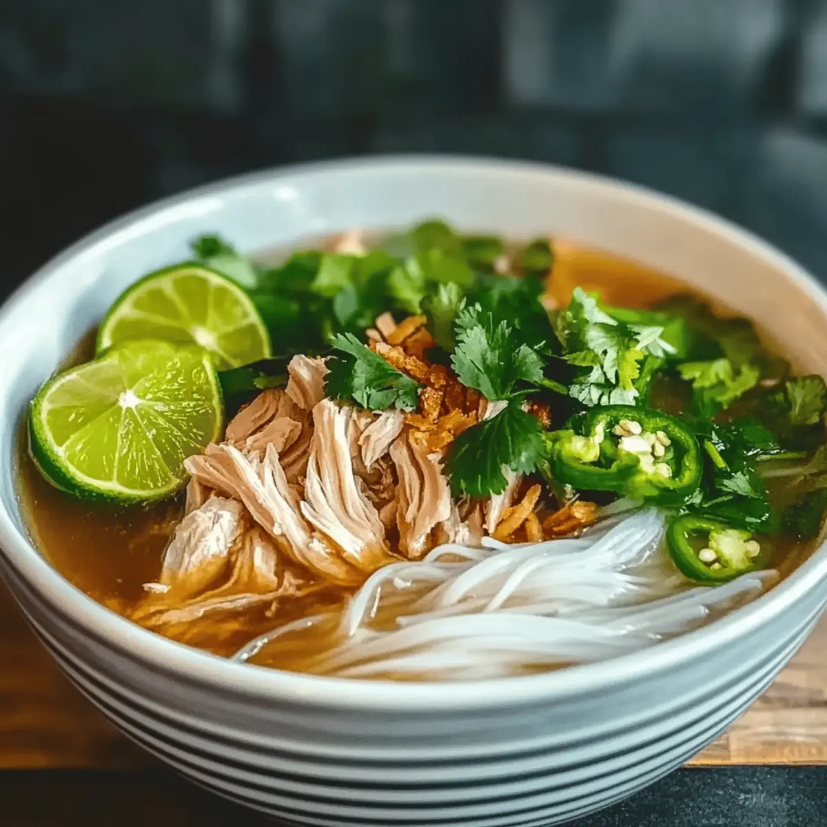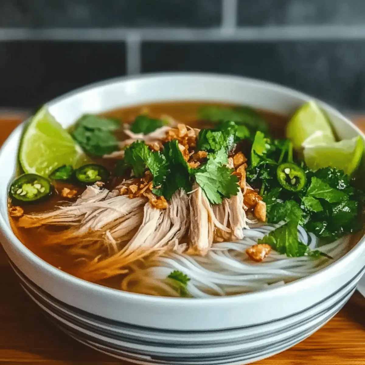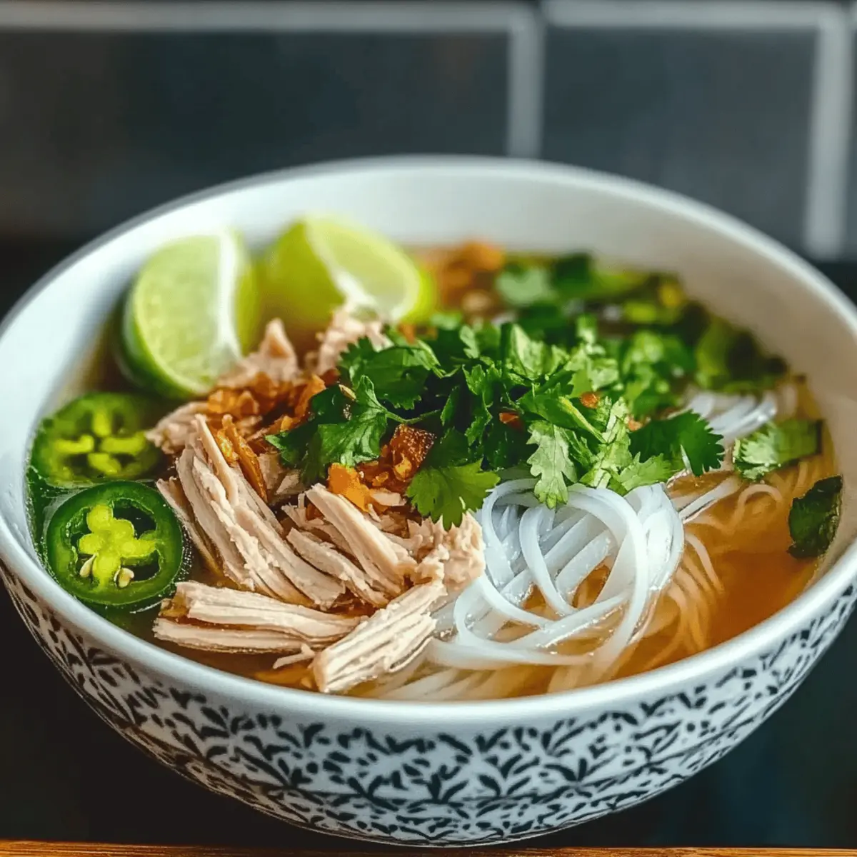 Garnish your Rotisserie Chicken Pho with a handful of fresh herbs like basil, cilantro, and mint—these add vibrant color and flavor. Serve lime wedges alongside, ready for a squeeze, and feel free to include sliced jalapeños and crunchy bean sprouts for extra texture.
