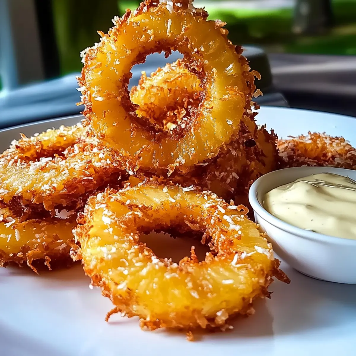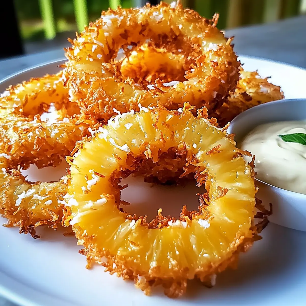 - Coat each pineapple ring first in flour, then in the egg mixture, and finally roll in coconut flakes.