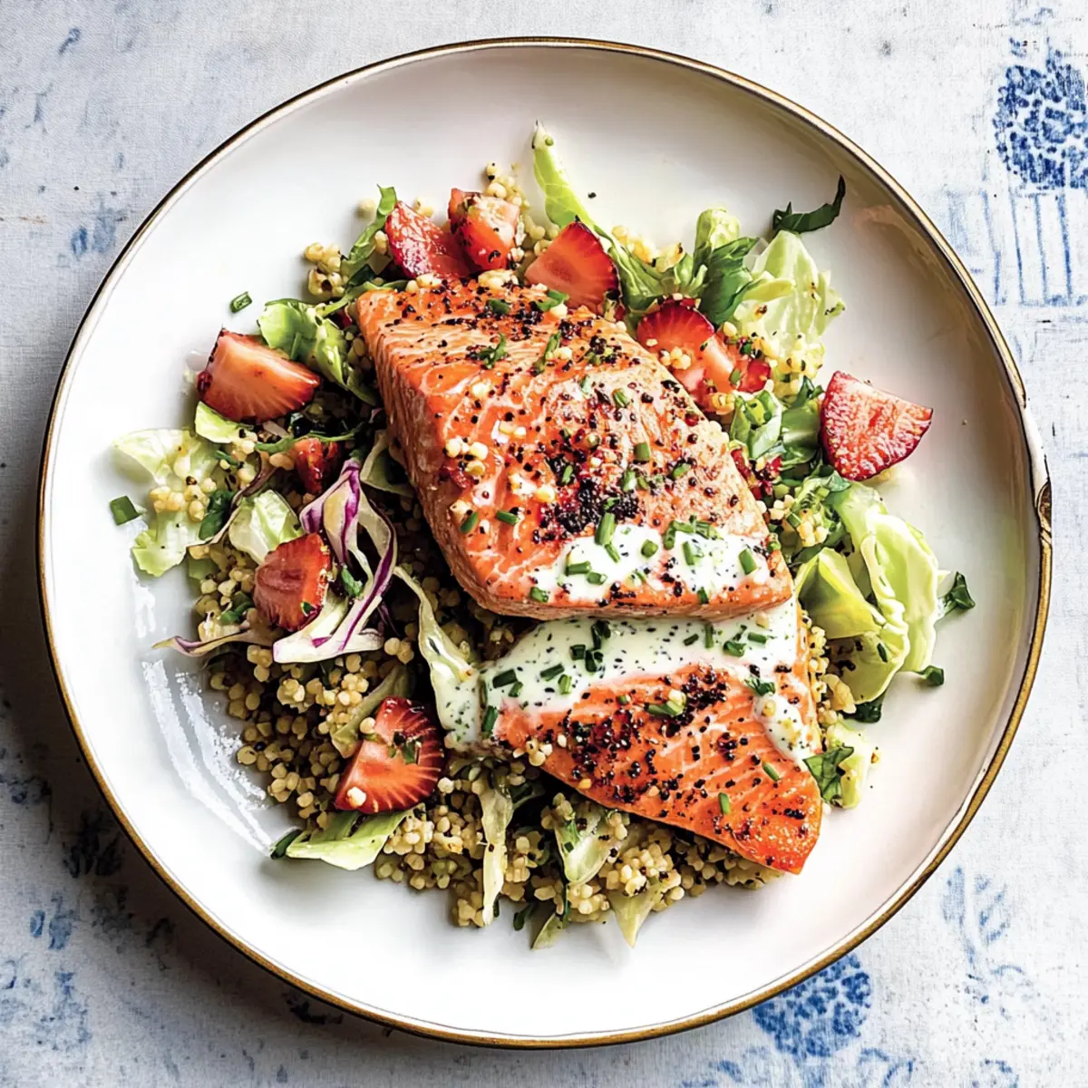 - In a large mixing bowl, combine cooled couscous, napa cabbage, and fennel. Toss with two-thirds of the dressing and fold in strawberries and roasted salmon.