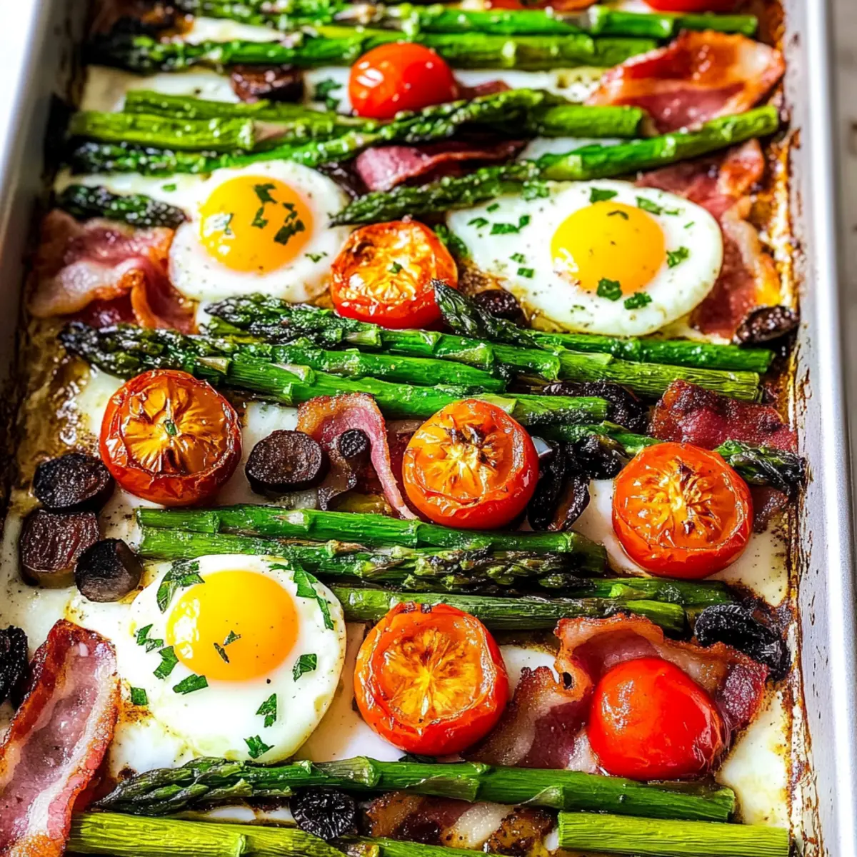 Making the Sheet Pan Breakfast Bake ahead of time is a fantastic way to save precious mornings! You can prep the vegetables and bacon up to 24 hours in advance. Simply wash and chop the asparagus, halve the tomatoes, and clean the mushrooms, then store them in an airtight container in the refrigerator. For the bacon, cook it until crisp, allow it to cool, and store it separately. When you're ready to bake, just toss everything into the greased pan, create your egg wells, and crack the eggs in before baking. This way, you'll enjoy just as delicious results without the morning rush!