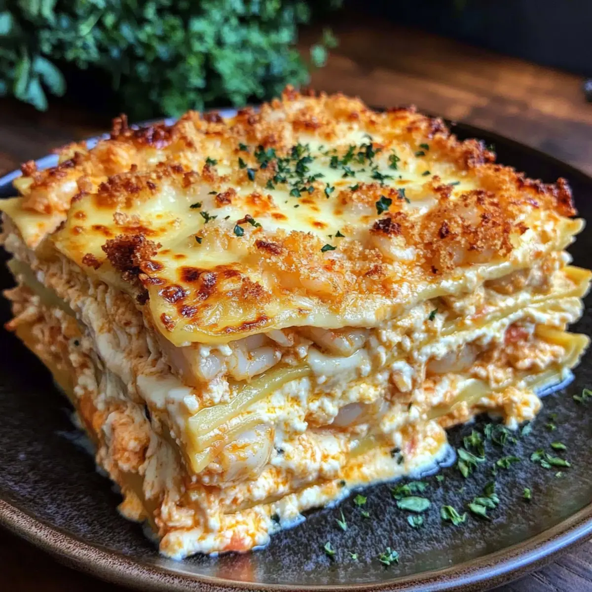 Once out of the oven, allow your lasagna to rest for 10 minutes. This cooling time helps the layers set for easier slicing. Before serving, consider garnishing with additional chopped parsley for a fresh touch. This adds color and a hint of herbal aroma, elevating the presentation of your delightful seafood dish.