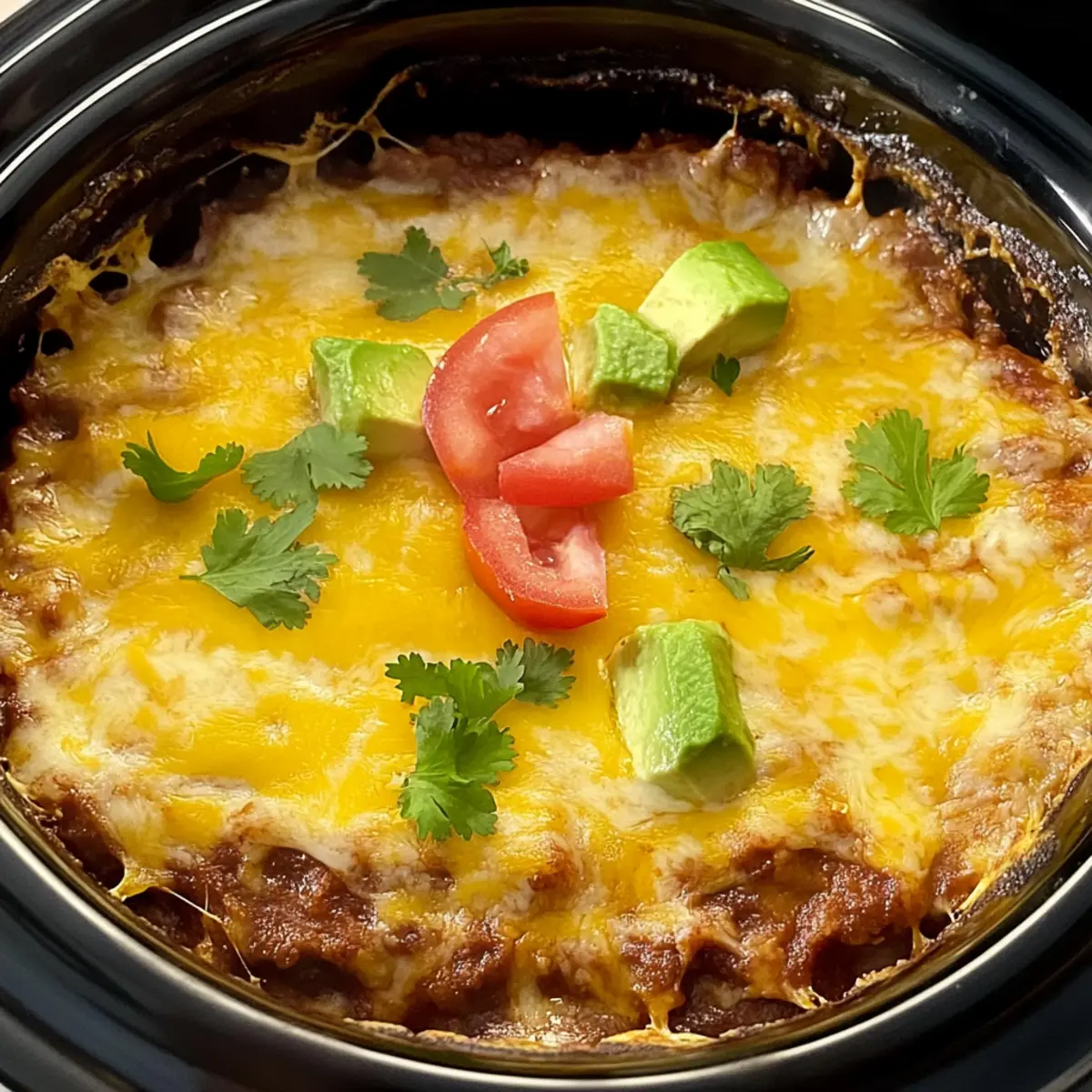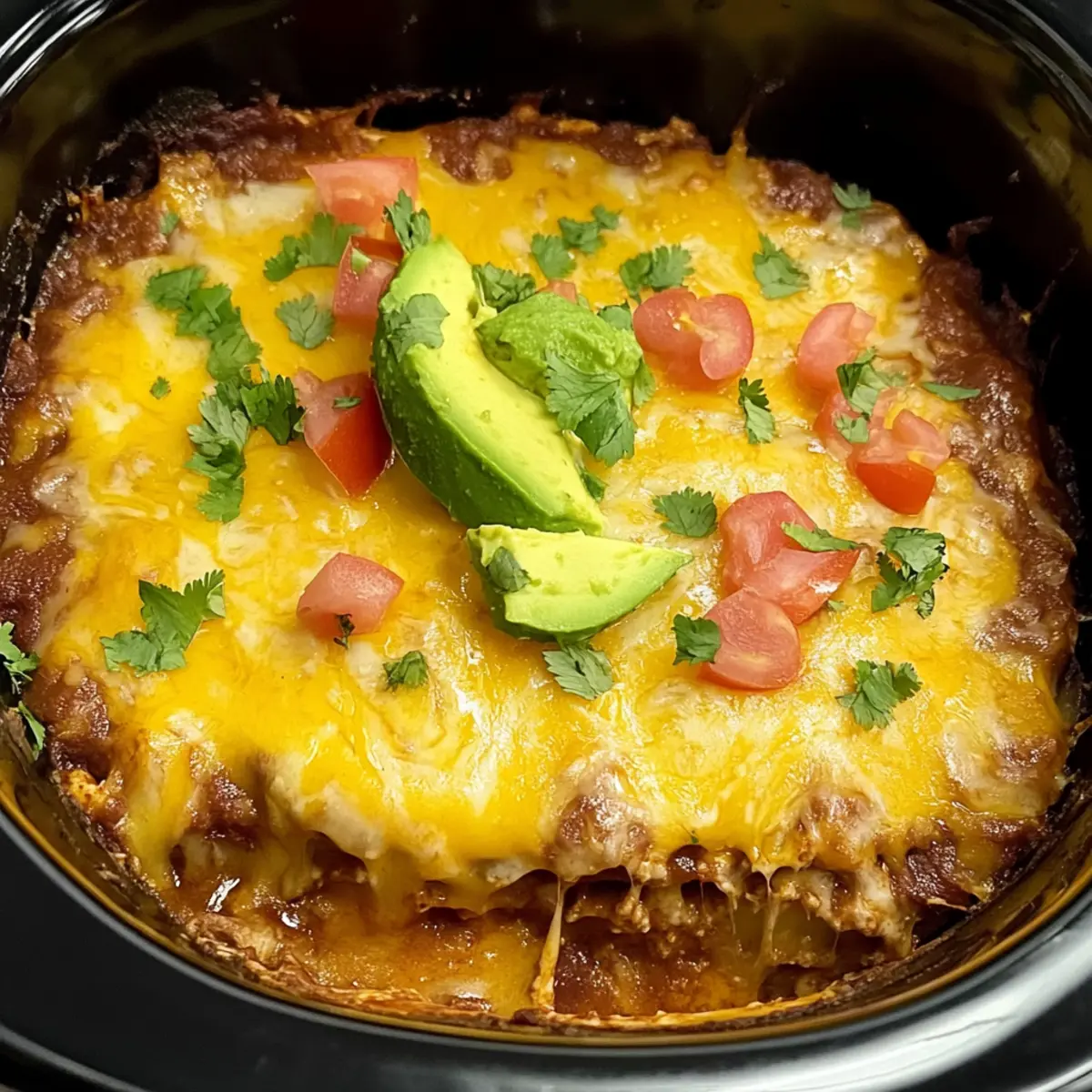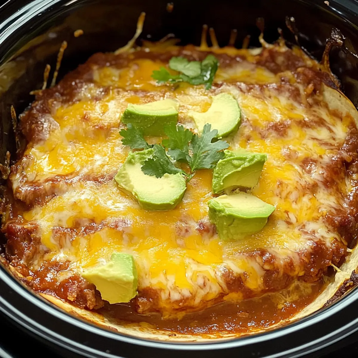 Once cooked, carefully lift the lid and let the Slow Cooker Layered Beef Enchiladas rest for about 10 minutes. This allows the layers to set a bit. Serve with sliced avocado and a sprinkle of fresh cilantro on top to brighten the flavors and add a lovely presentation that everyone will enjoy.