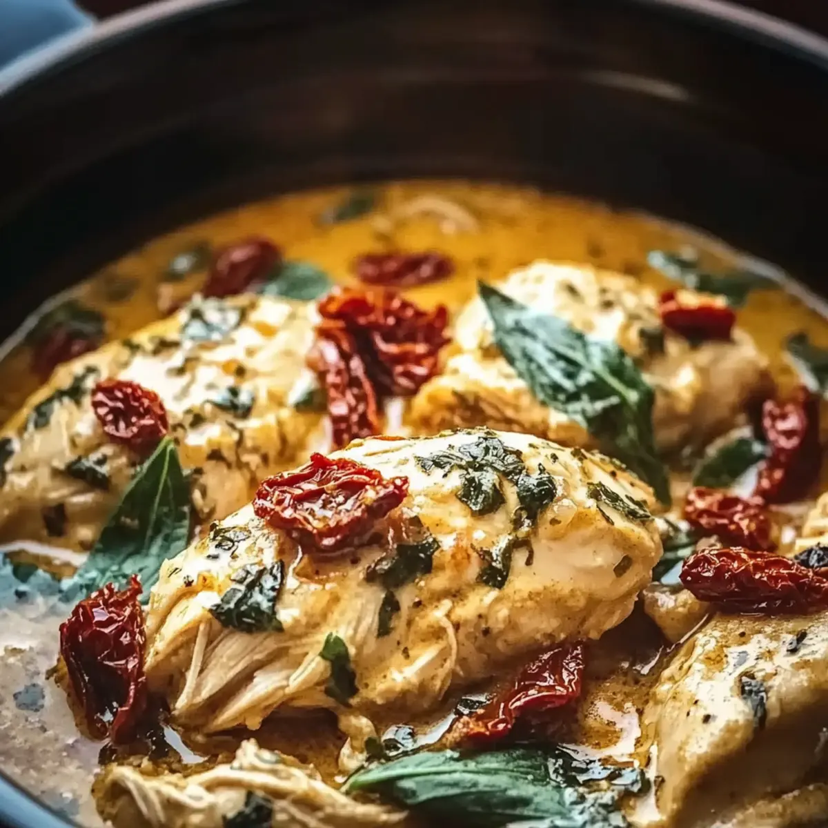 Pour the chicken broth and heavy cream over the seasoned chicken layer. The liquids should thoroughly coat the chicken and sun-dried tomatoes while providing moisture needed for cooking. This creamy base will come alive during the slow cooking process, creating a luscious sauce you’ll adore.