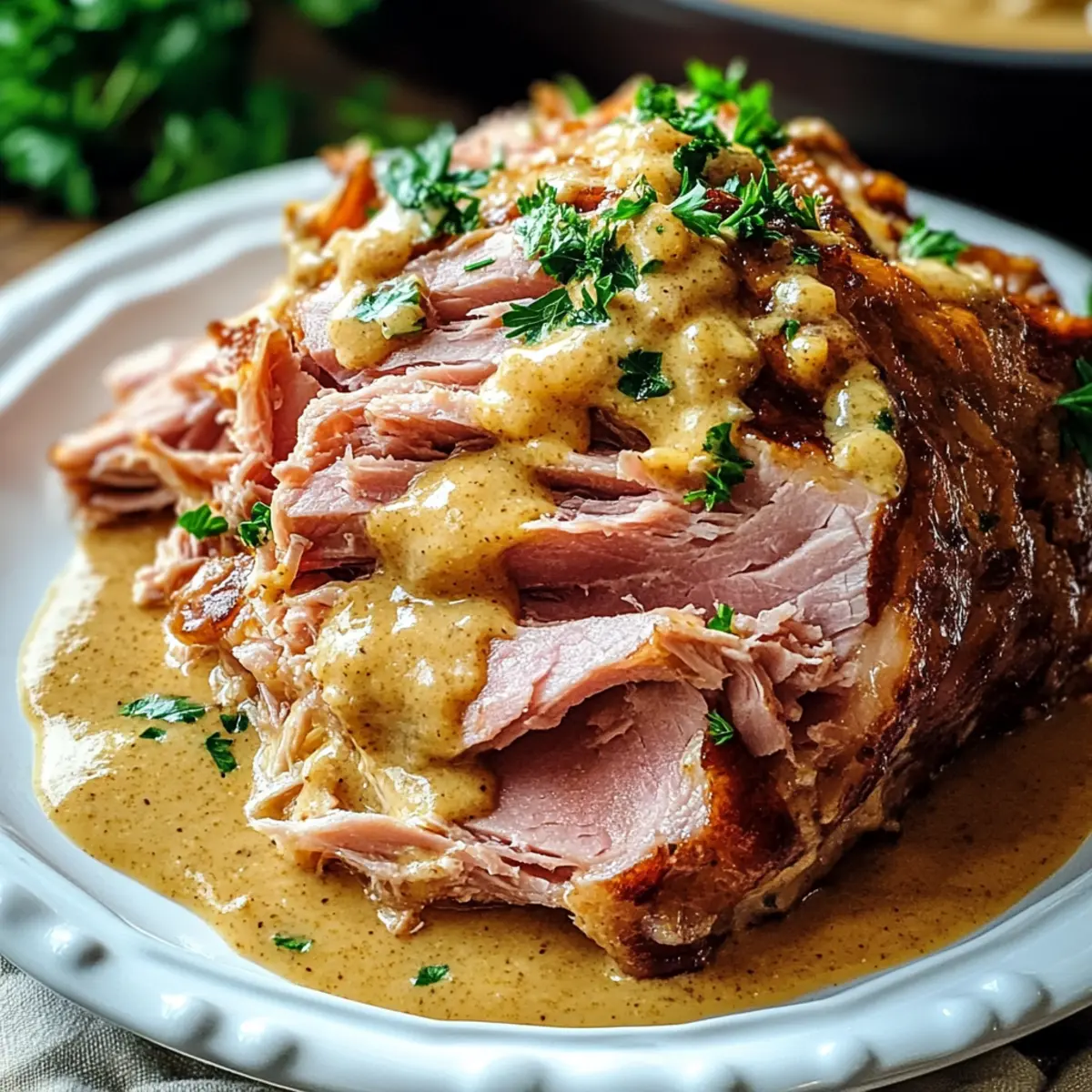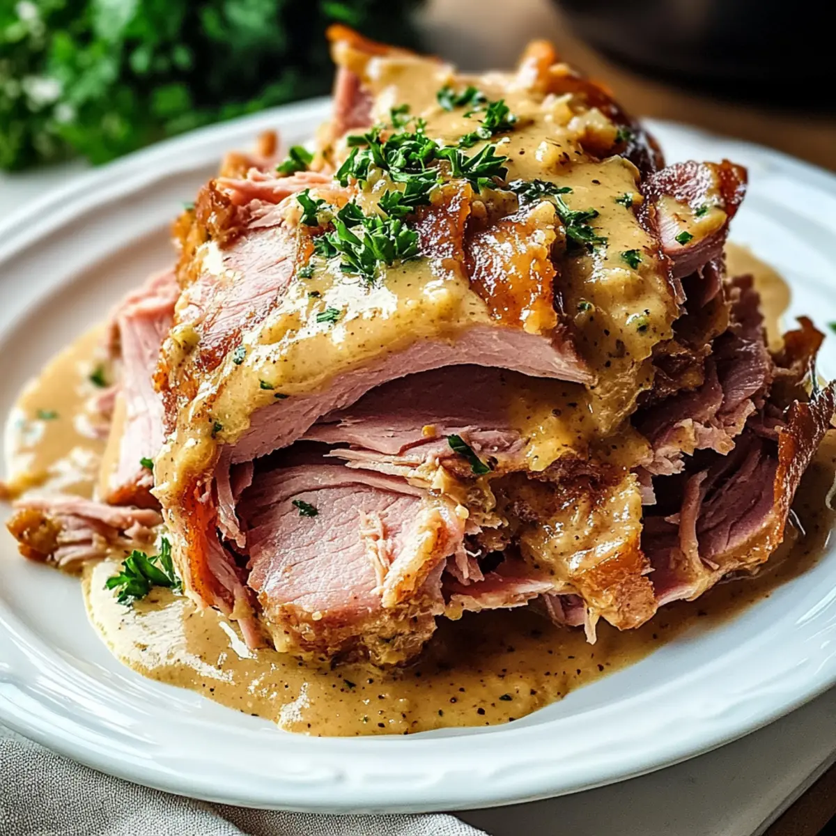 - Return the shredded ham to the slow cooker and pour the creamy mustard sauce over it, stirring gently to coat.