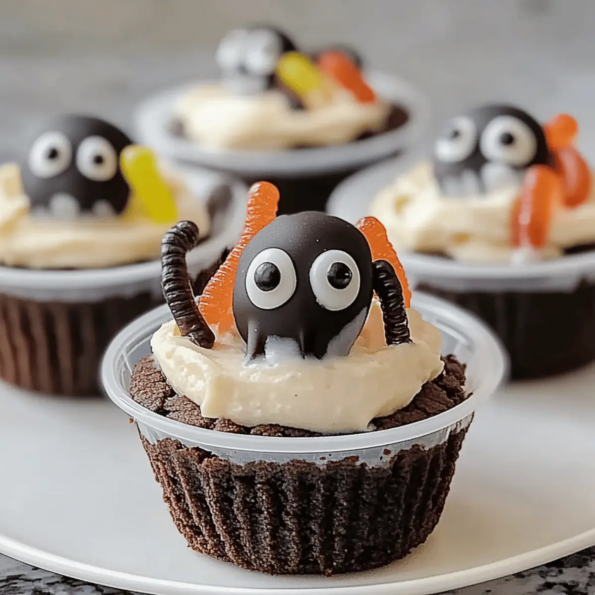 - Top each cup with gummy worms and candy eyeballs creatively.