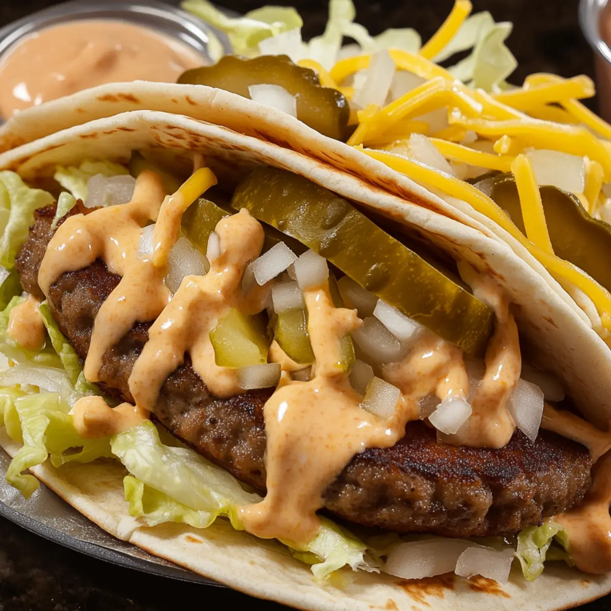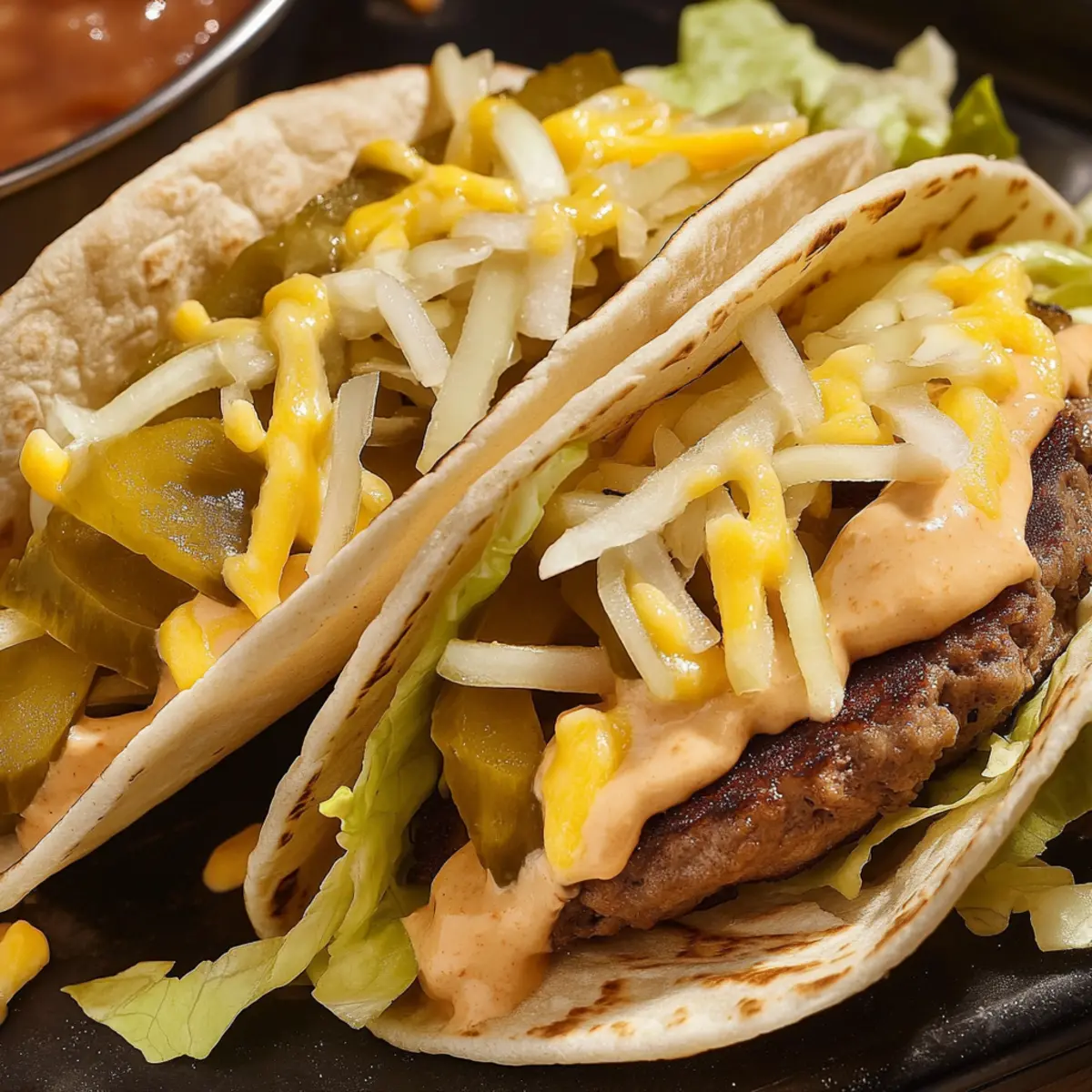 Layer the cooked burgers onto the warmed tortillas, and then top each with the prepared pickles, diced onions, and a generous drizzle of your homemade sauce. Feel free to get creative with additional toppings like jalapeños or avocado for an extra burst of flavor!