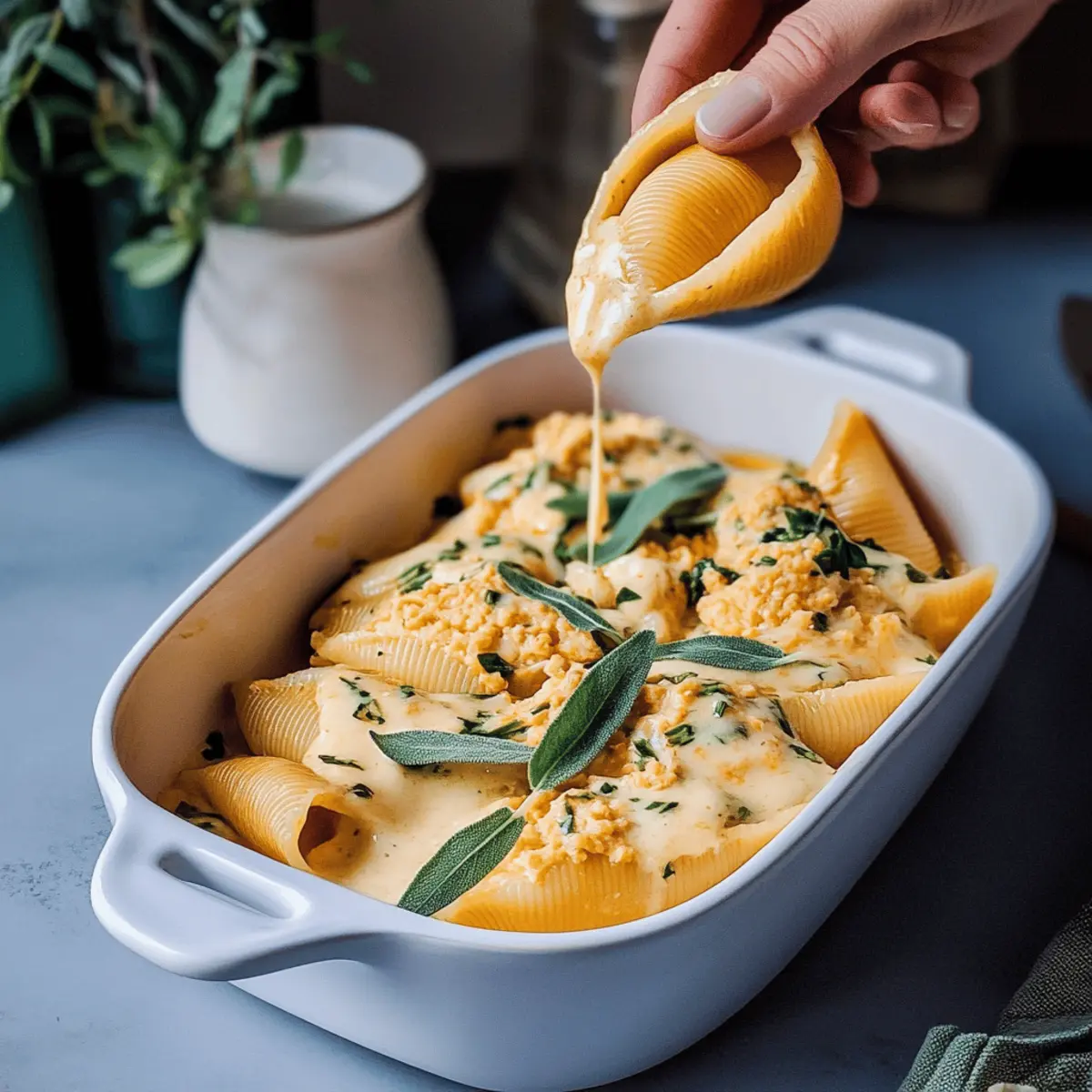Spread a generous layer of the béchamel sauce into the bottom of a baking dish to keep the shells from sticking. Carefully stuff each cooked jumbo shell with the tofu and pumpkin mixture, placing them in the dish seam side up. Once all the shells are filled, pour the remaining béchamel sauce over the top and sprinkle with your favorite fresh herbs for added flavor.
